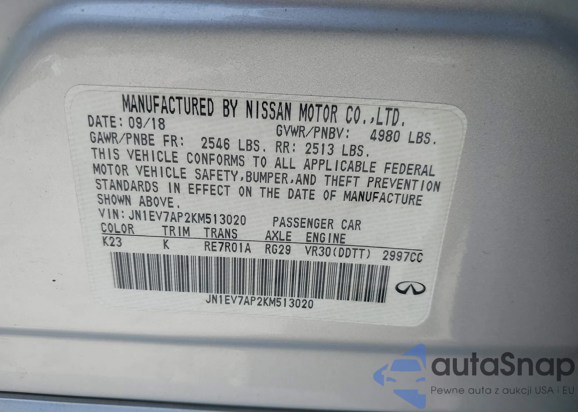 LOT: 42542293 VIN: JN1EV7AP2KM513020