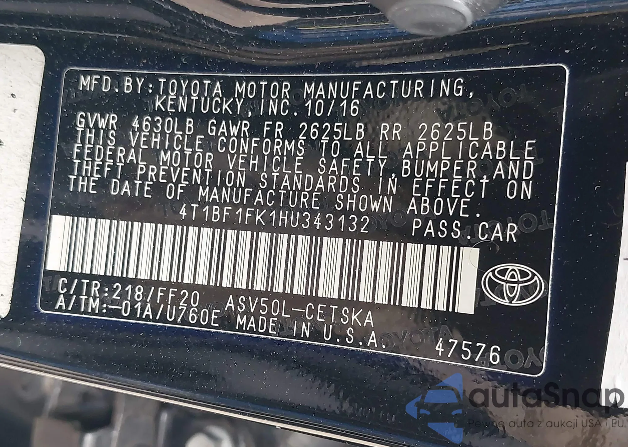 • VIN 4T1BF1FK1HU343132