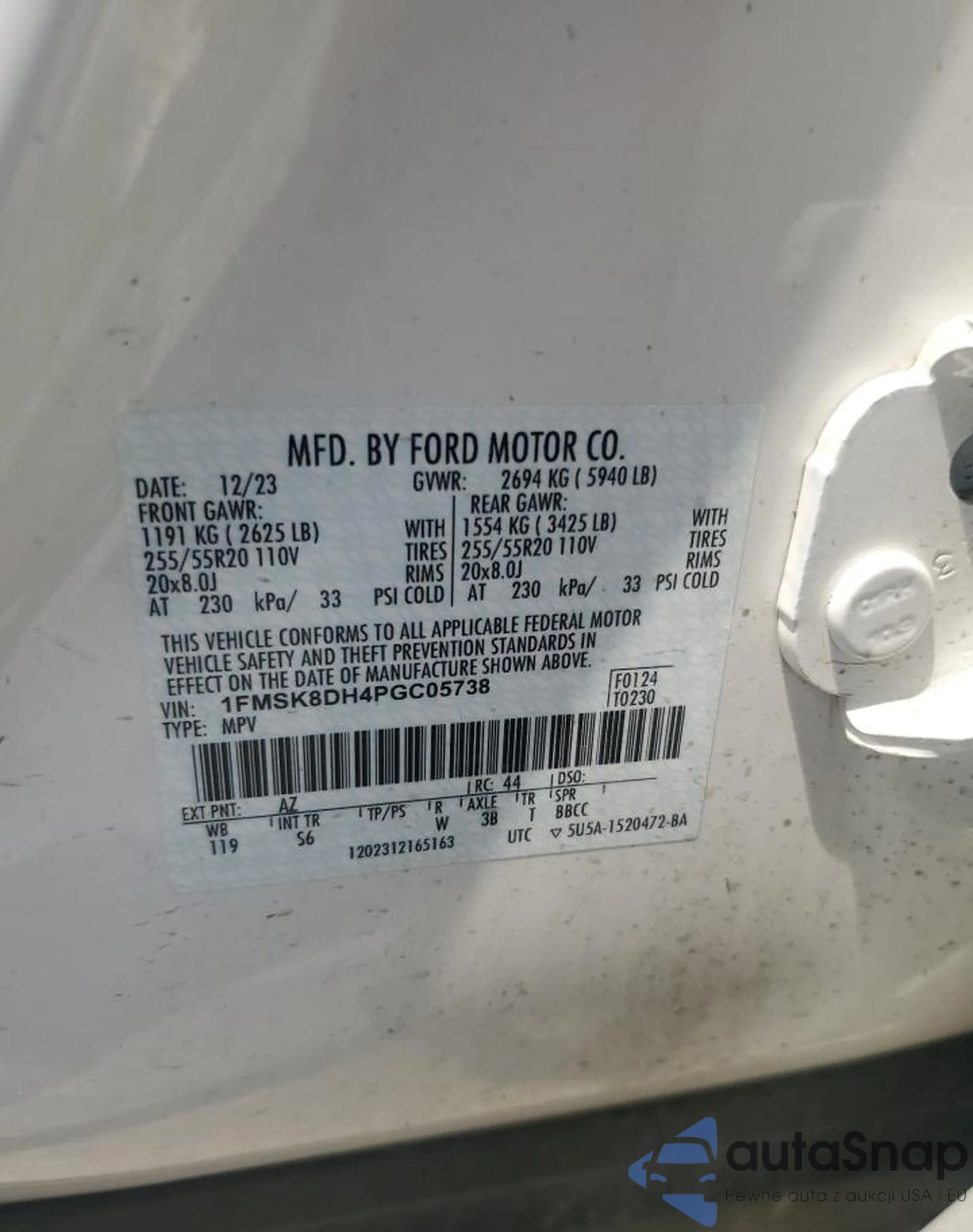 LOT: 60815665 VIN: 1FMSK8DH4PGC05738