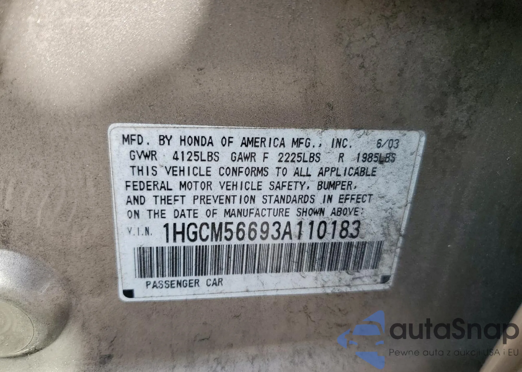 LOT: 61654705 VIN: 1HGCM56693A110183
