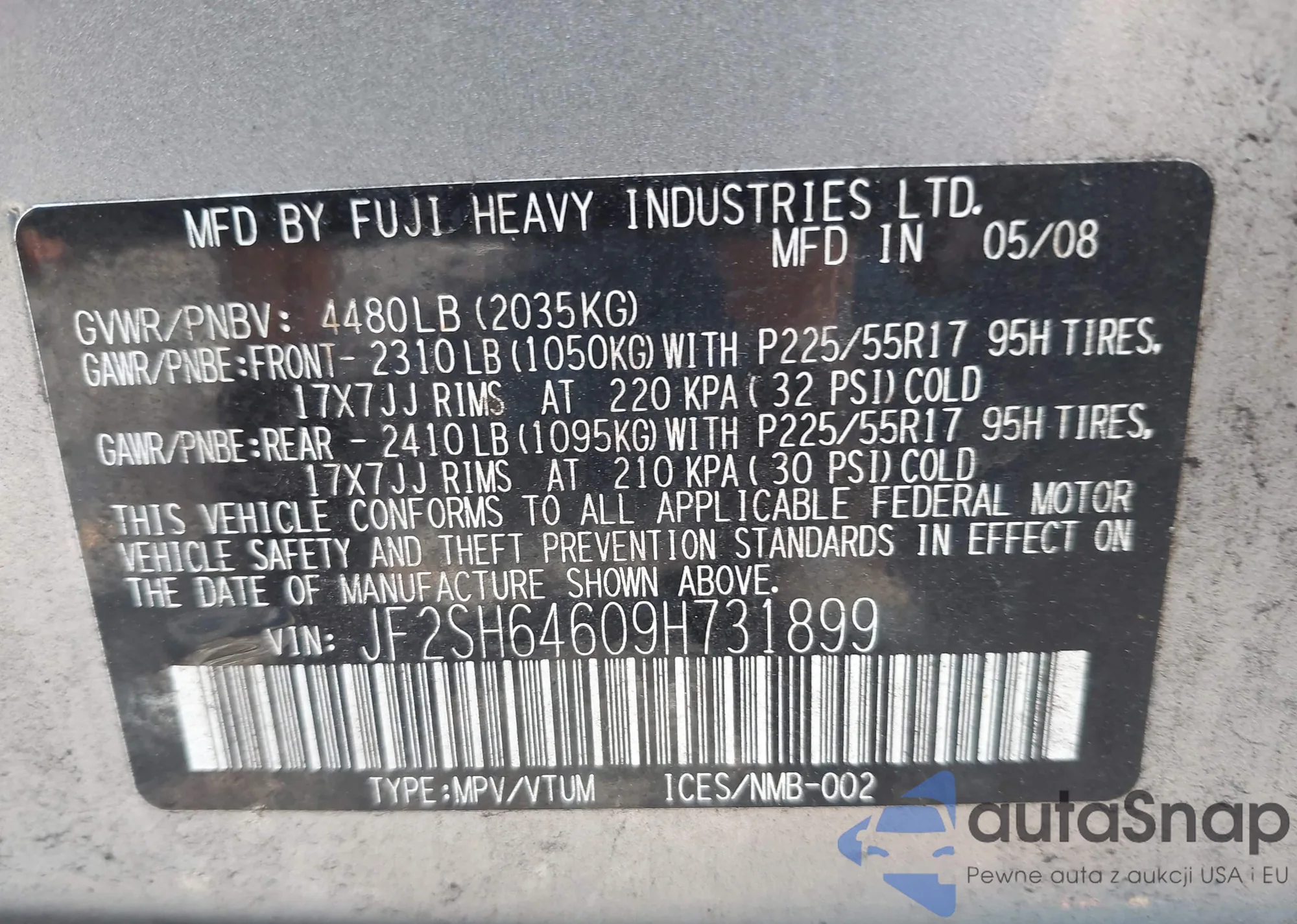 • VIN JF2SH64609H731899