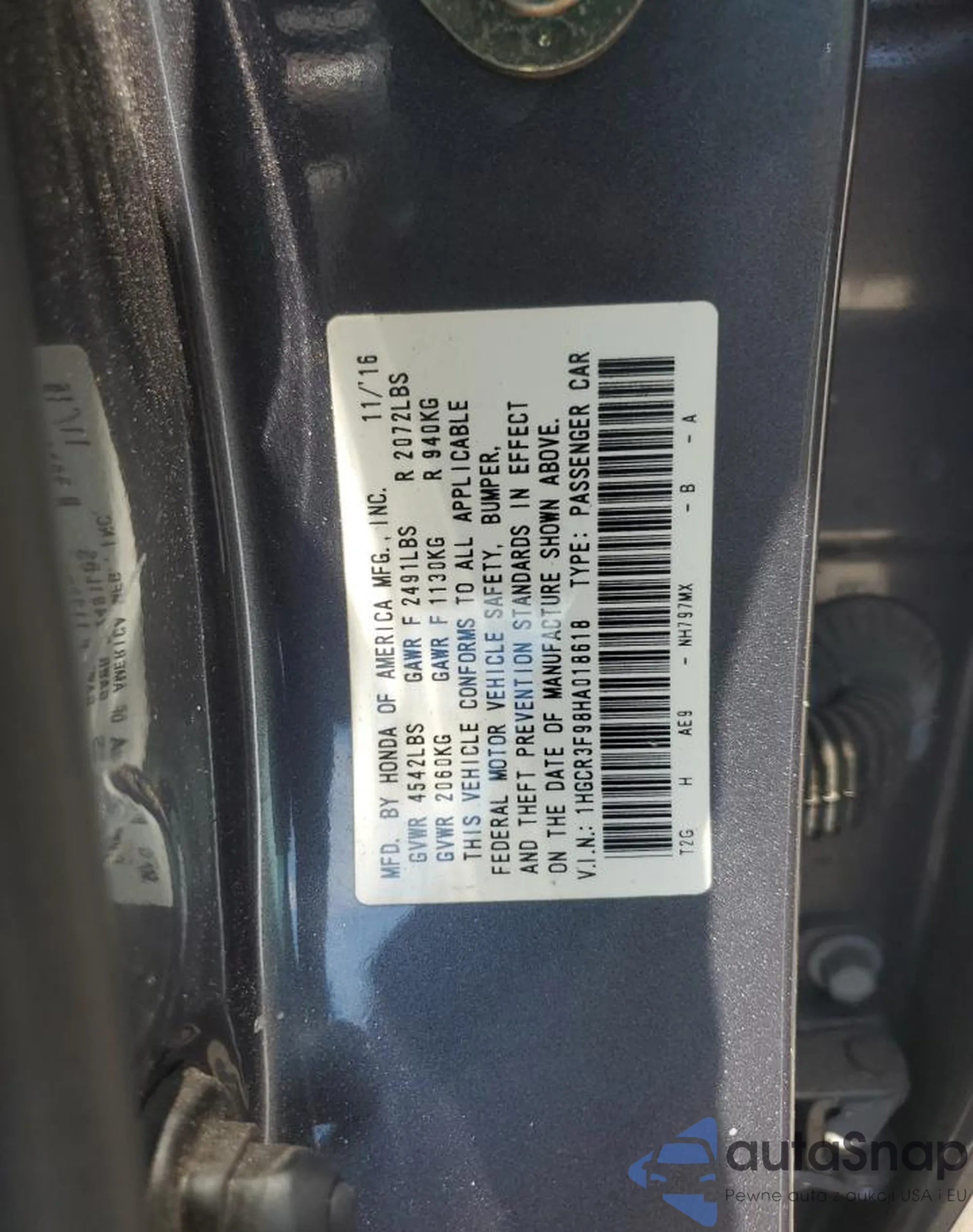 LOT: 65340815 VIN: 1HGCR3F98HA018618