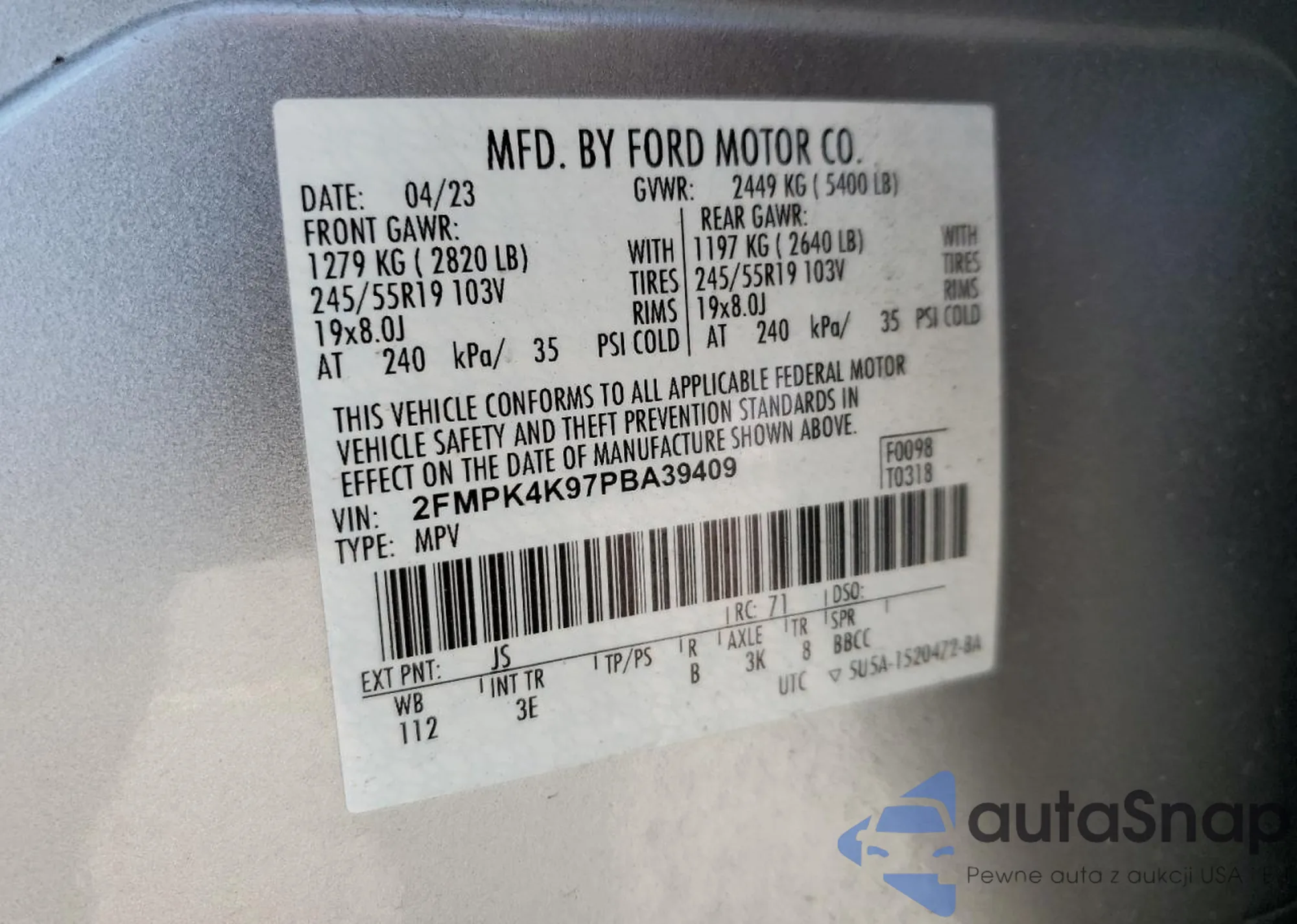 LOT: 65536255 VIN: 2FMPK4K97PBA39409
