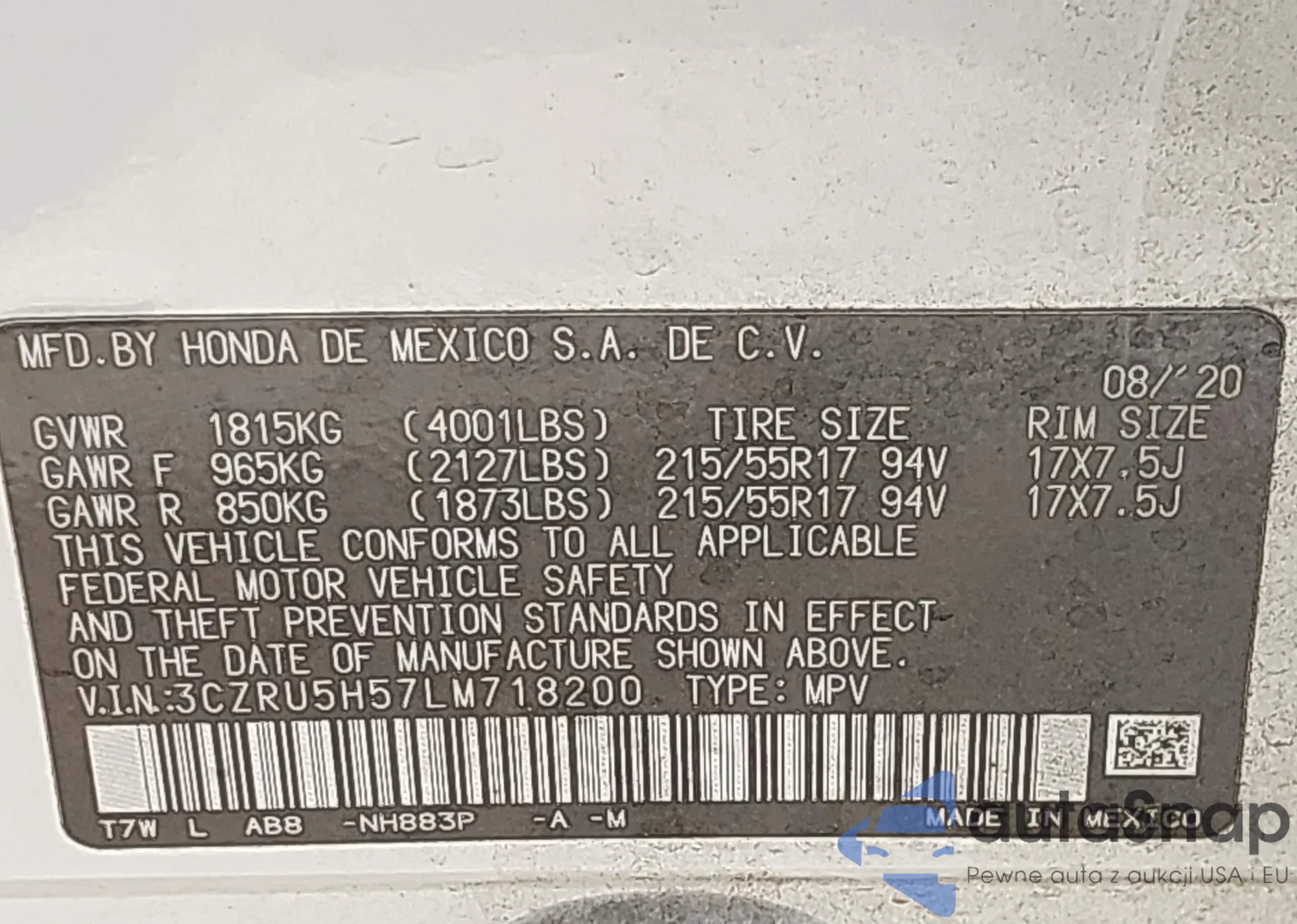LOT: 42317177 VIN: 3CZRU5H57LM718200