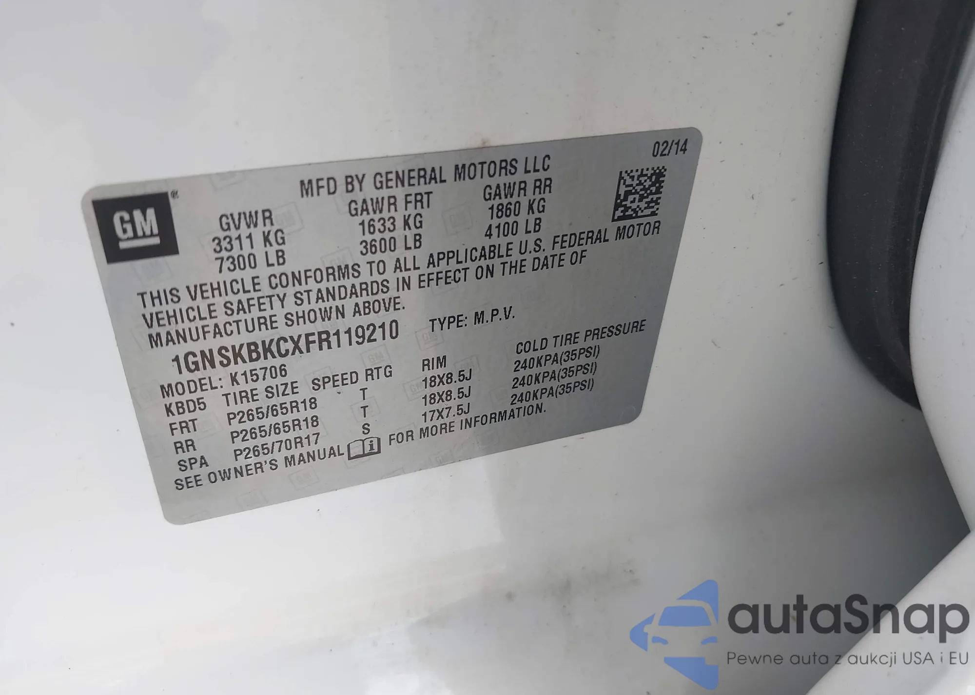 LOT: 42717594 VIN: 1GNSKBKCXFR119210