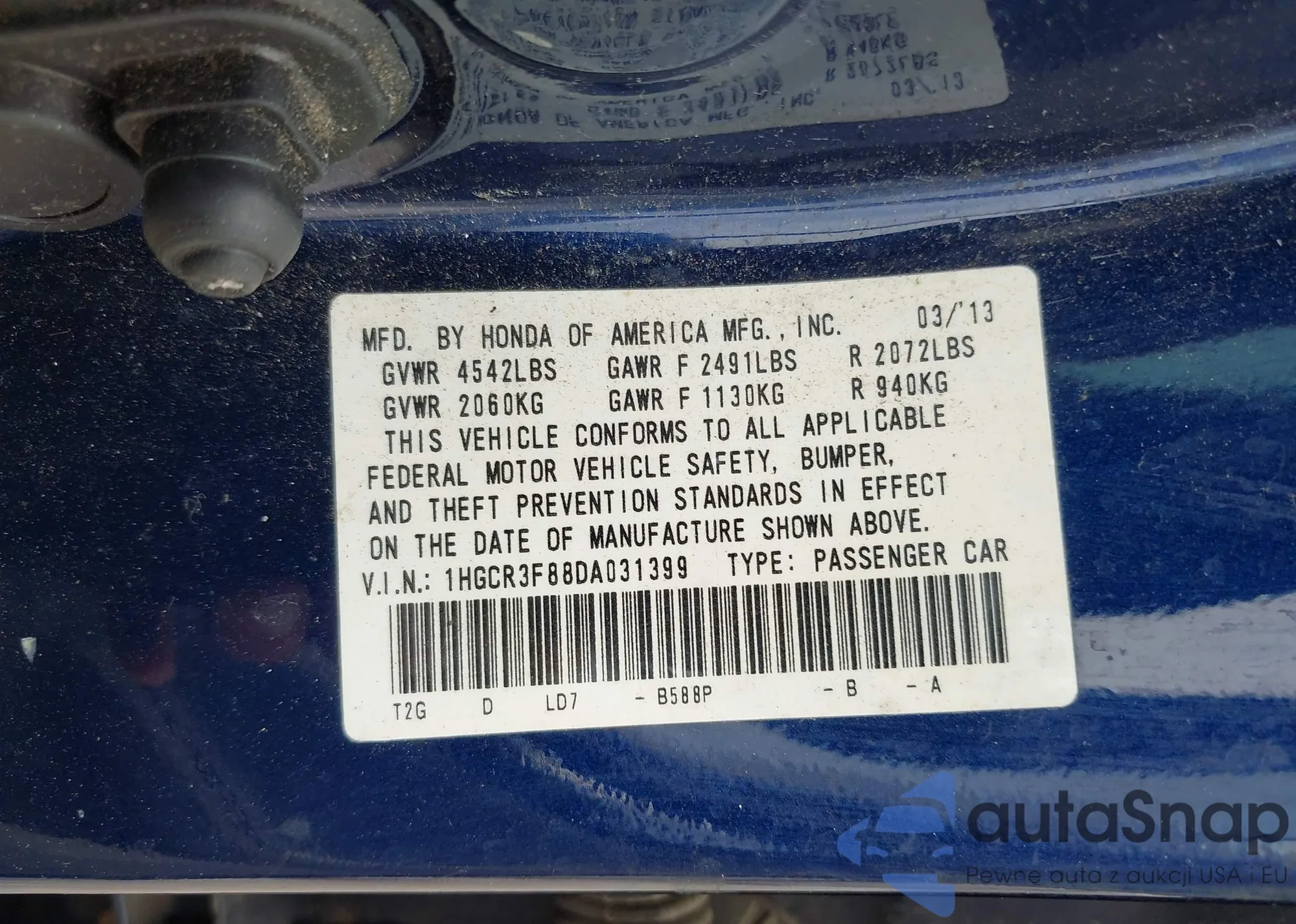 LOT: 42788591 VIN: 1HGCR3F88DA031399