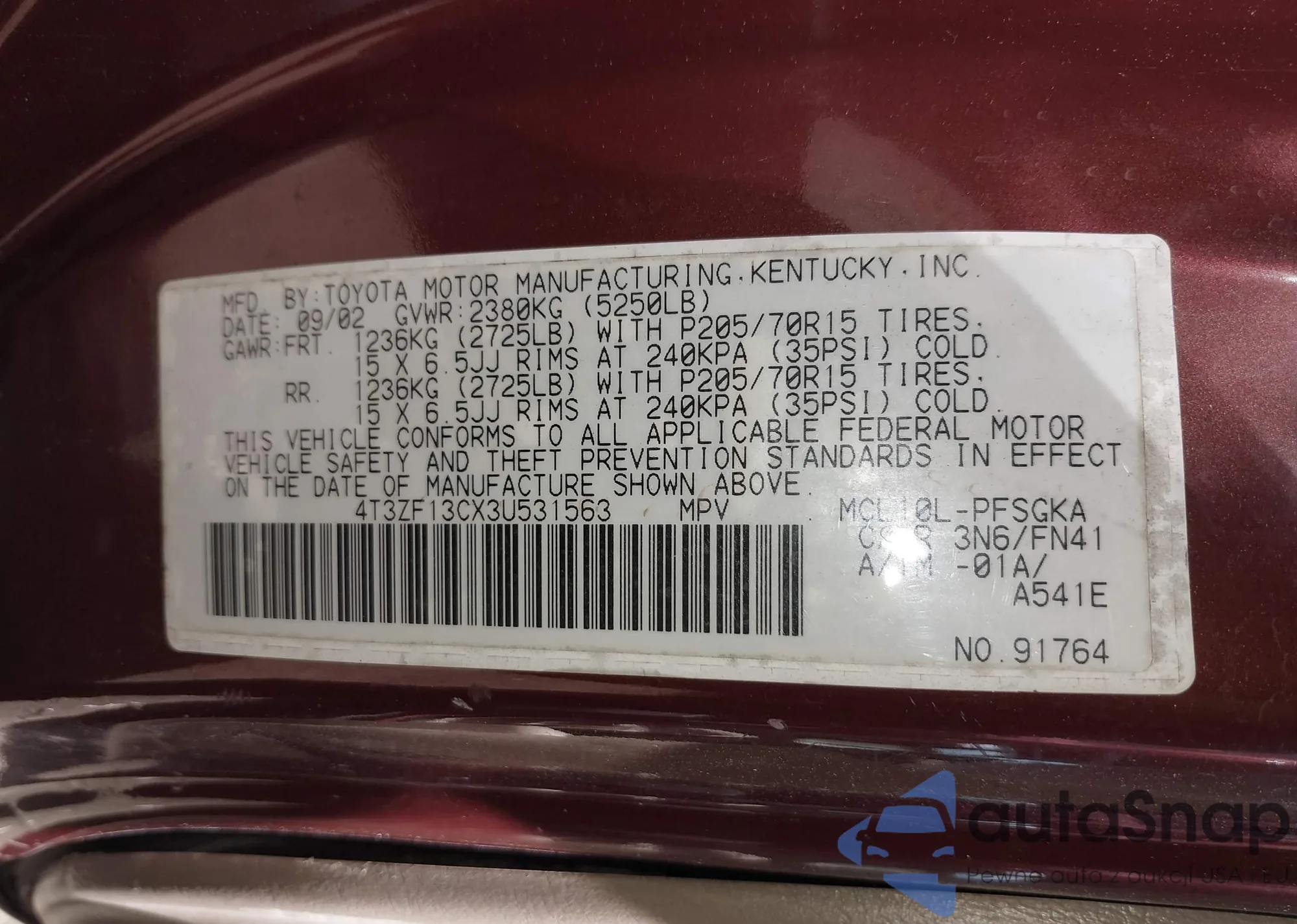 • VIN 4T3ZF13CX3U531563