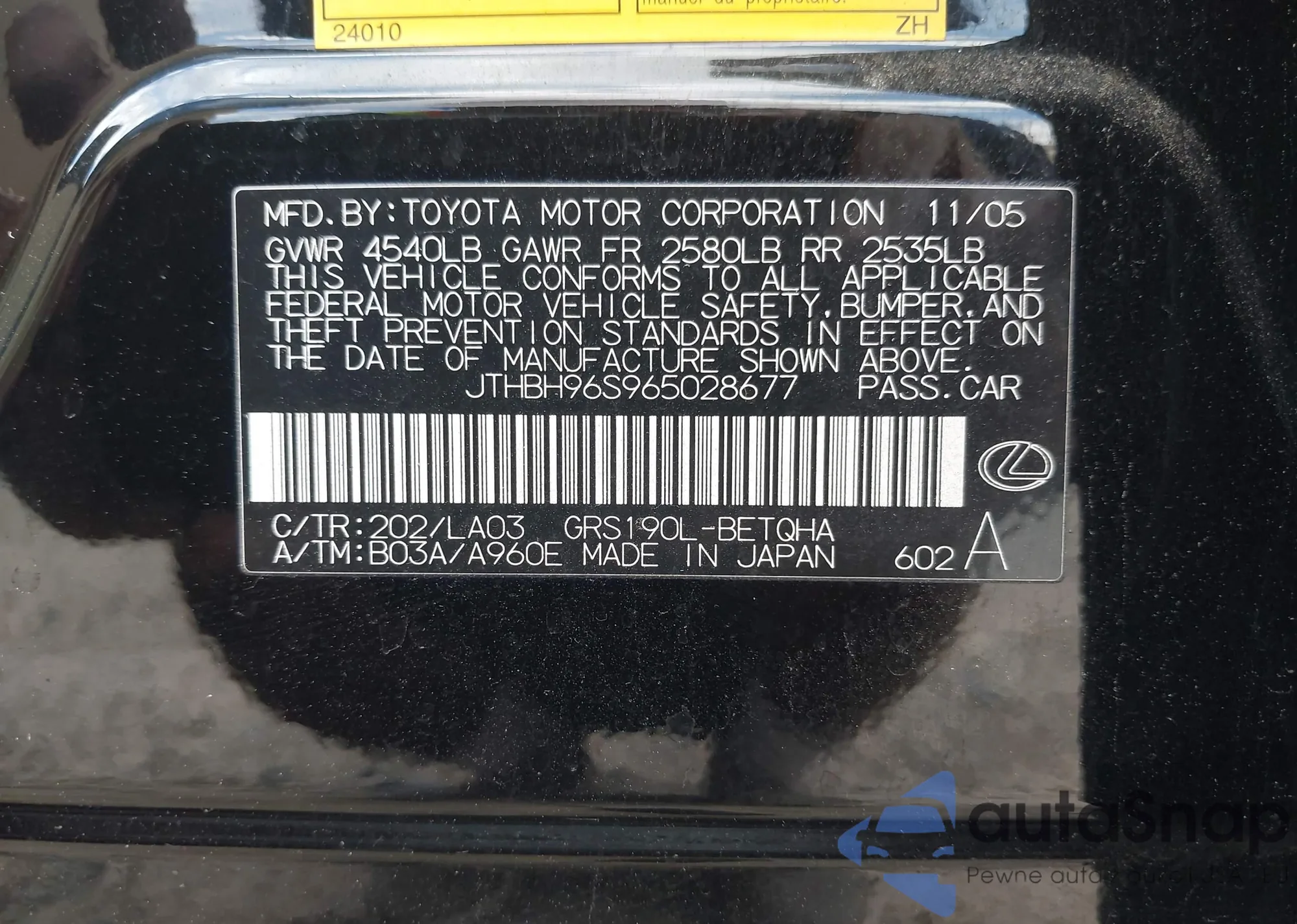 LOT: 42825141 VIN: JTHBH96S965028677
