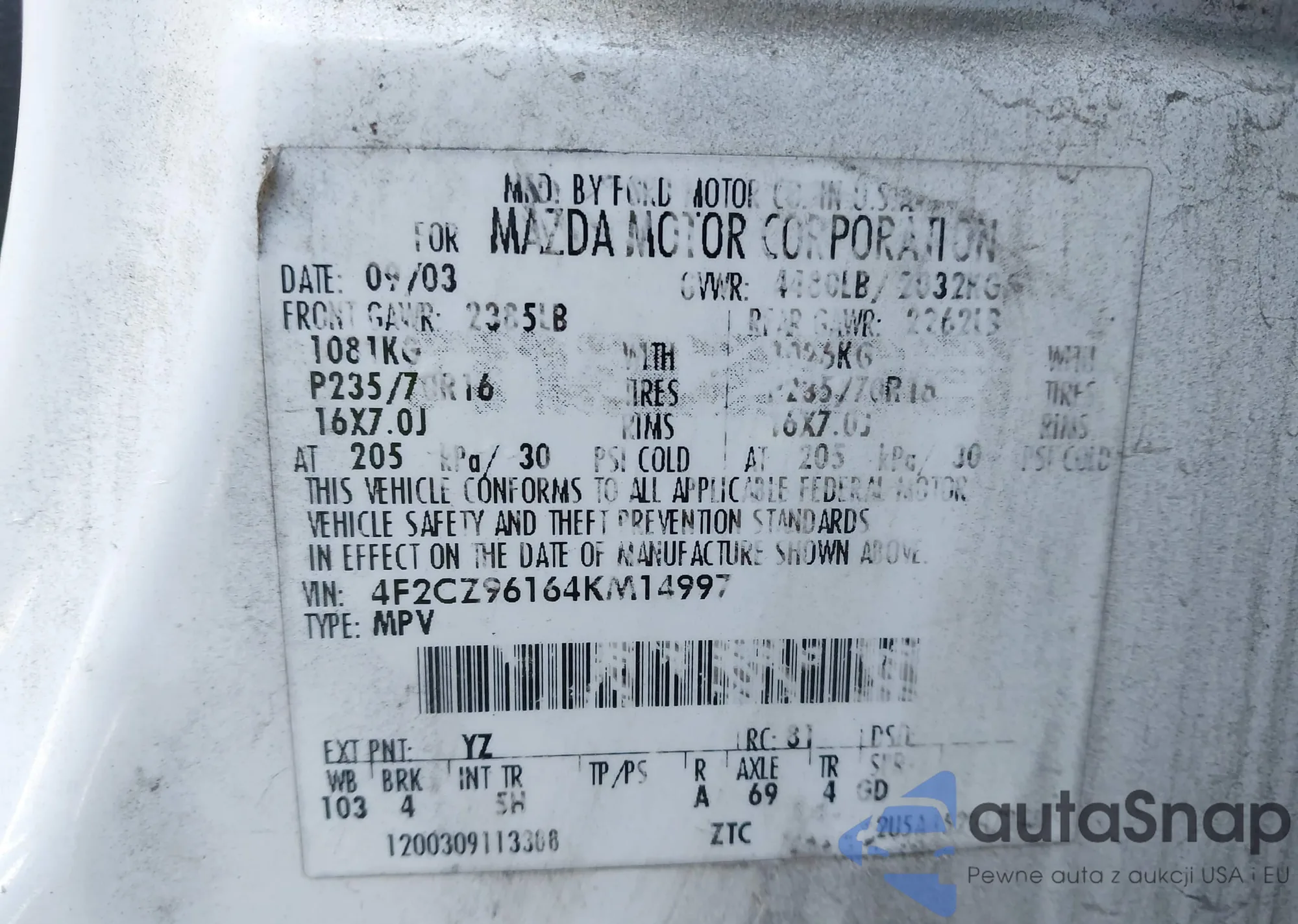 LOT: 42823402 VIN: 5Y2SL67019Z403809