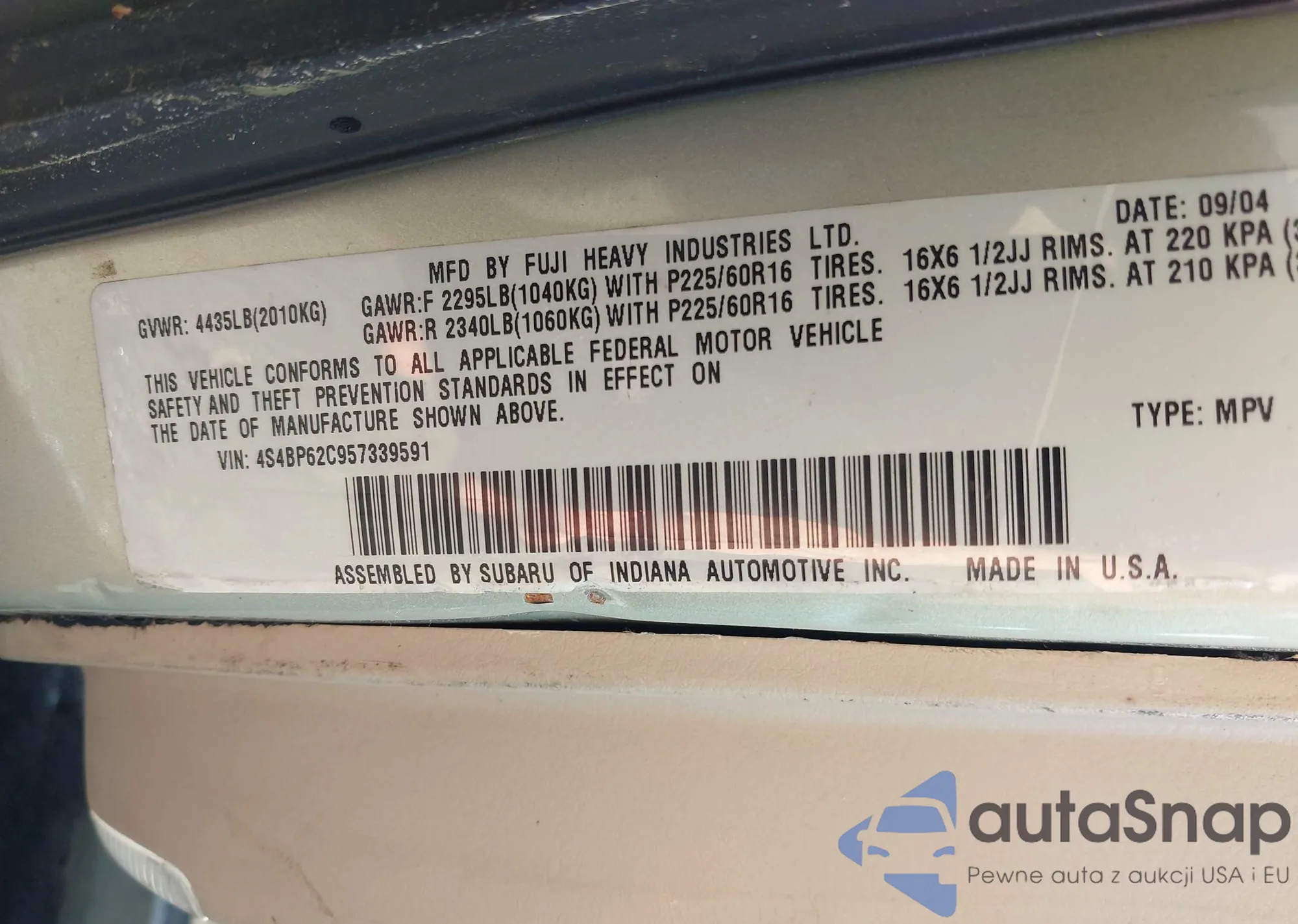 • VIN 4S4BP62C957339591