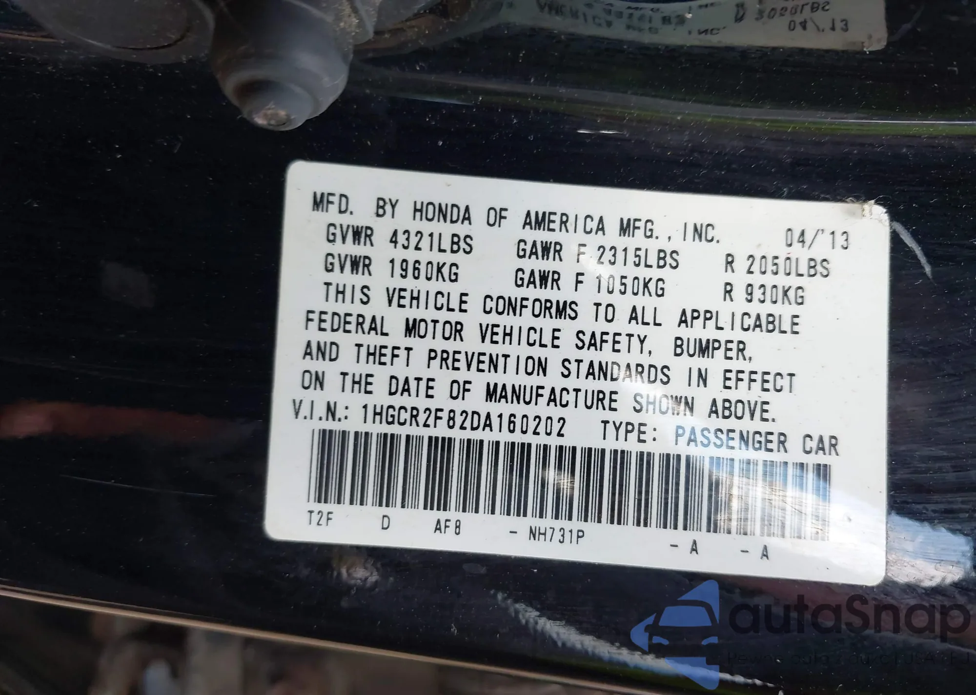 • VIN 1HGCR2F82DA160202