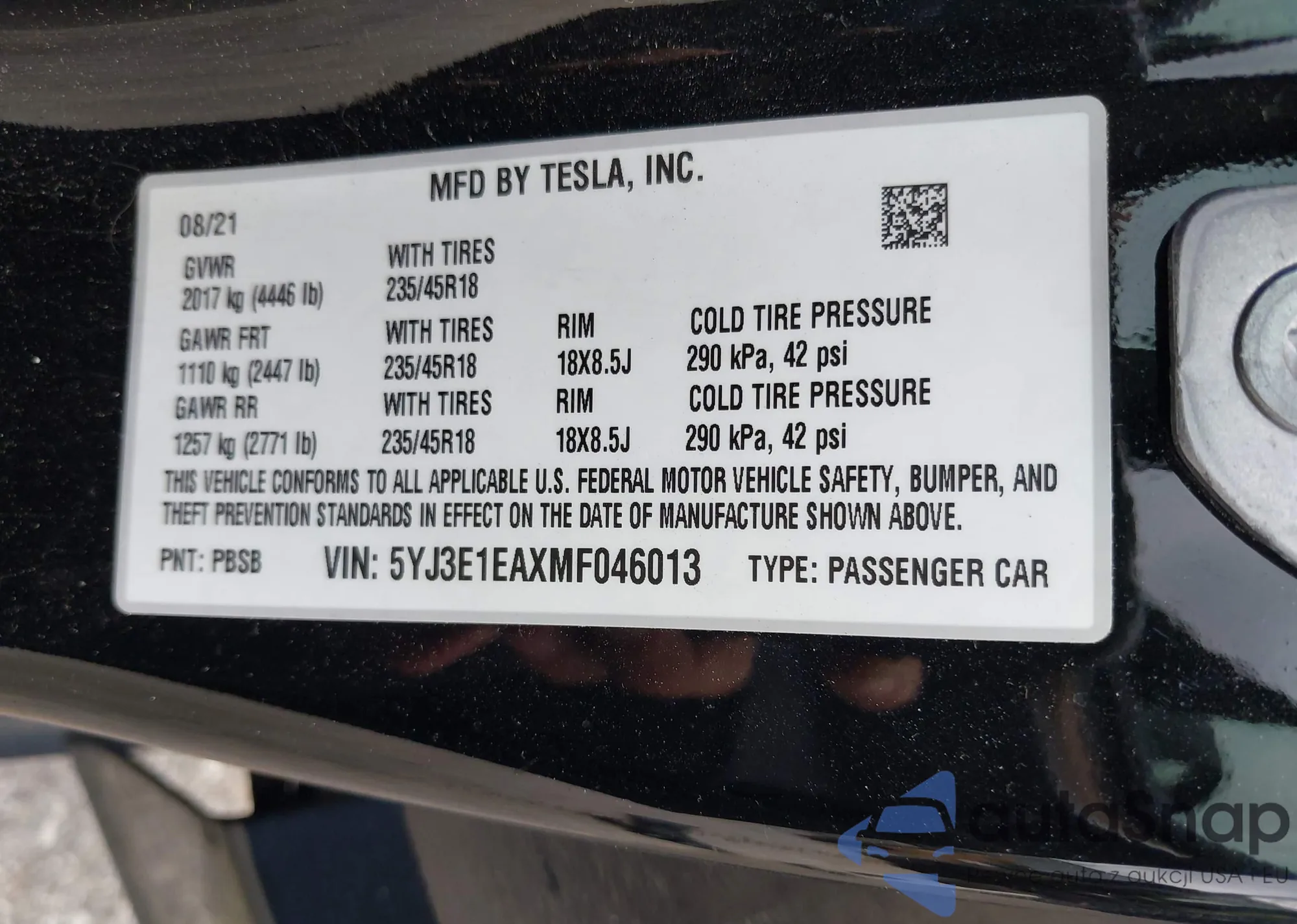 • VIN 5YJ3E1EAXMF046013