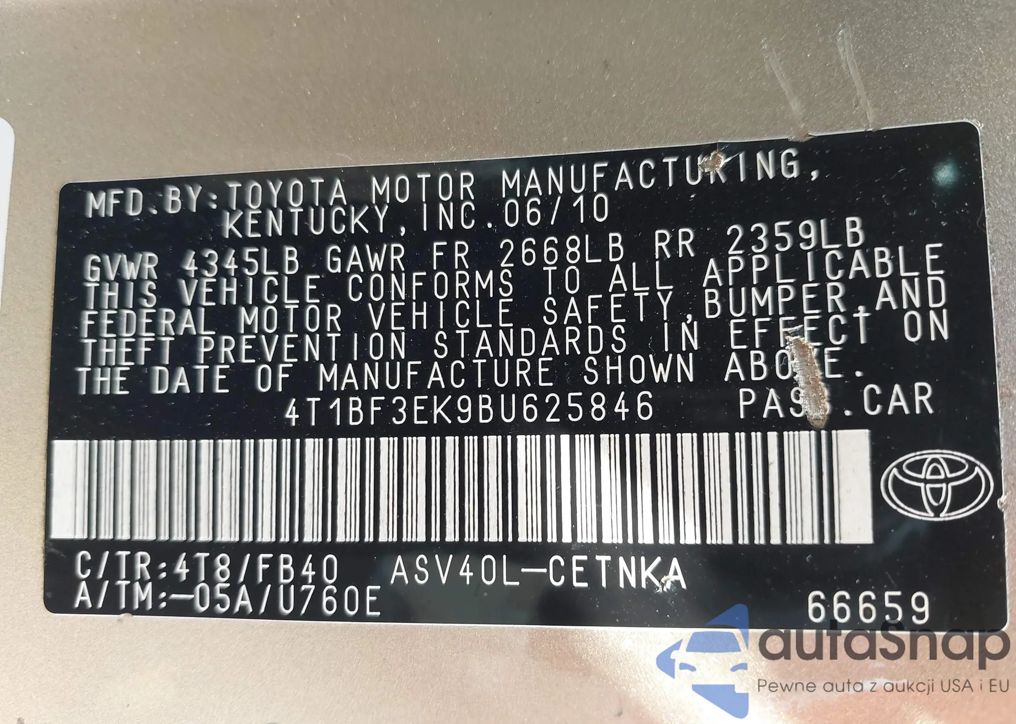 • VIN 4T1BF3EK9BU625846