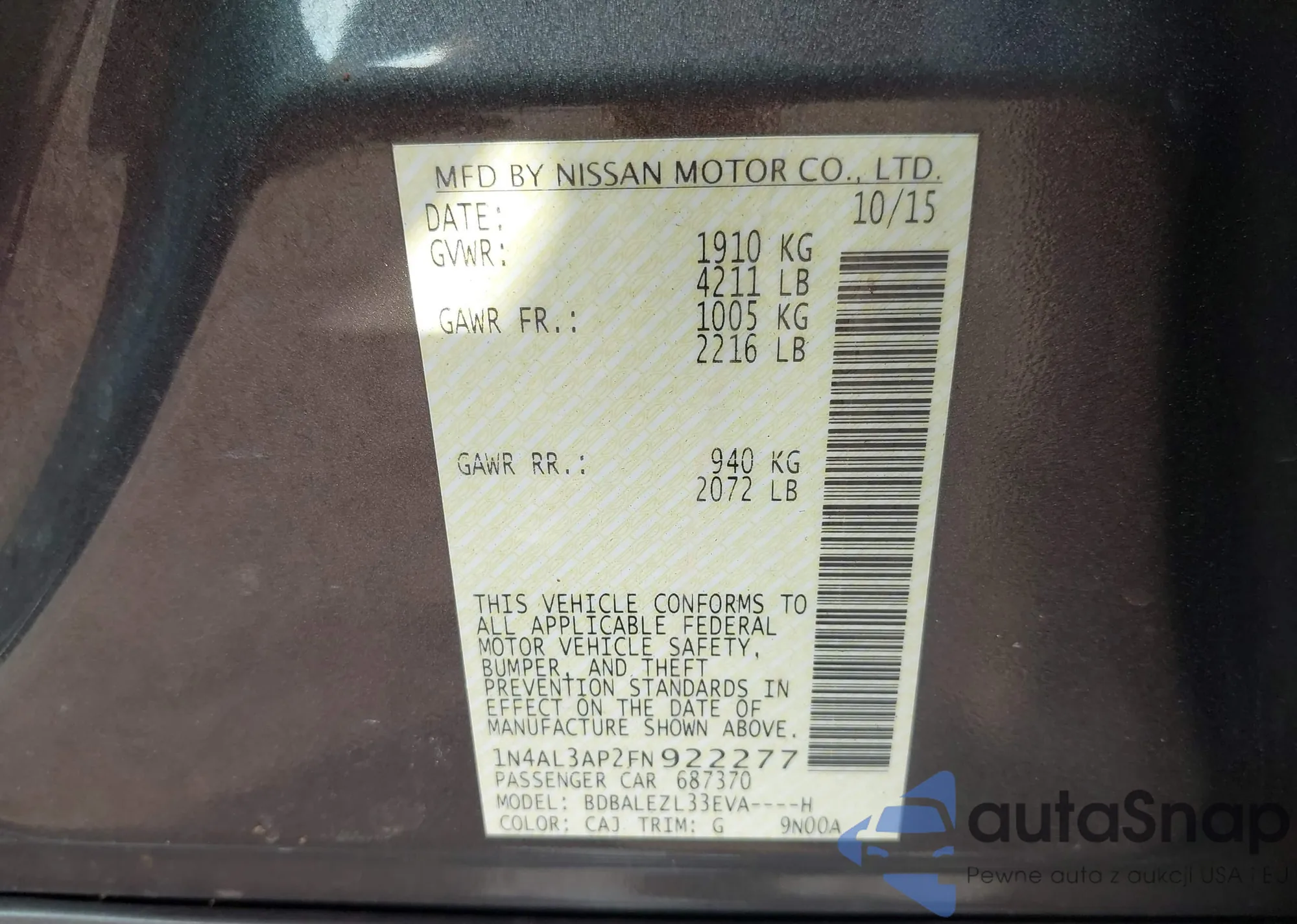 LOT: 42936401 VIN: 1N4AL3AP2FN922277