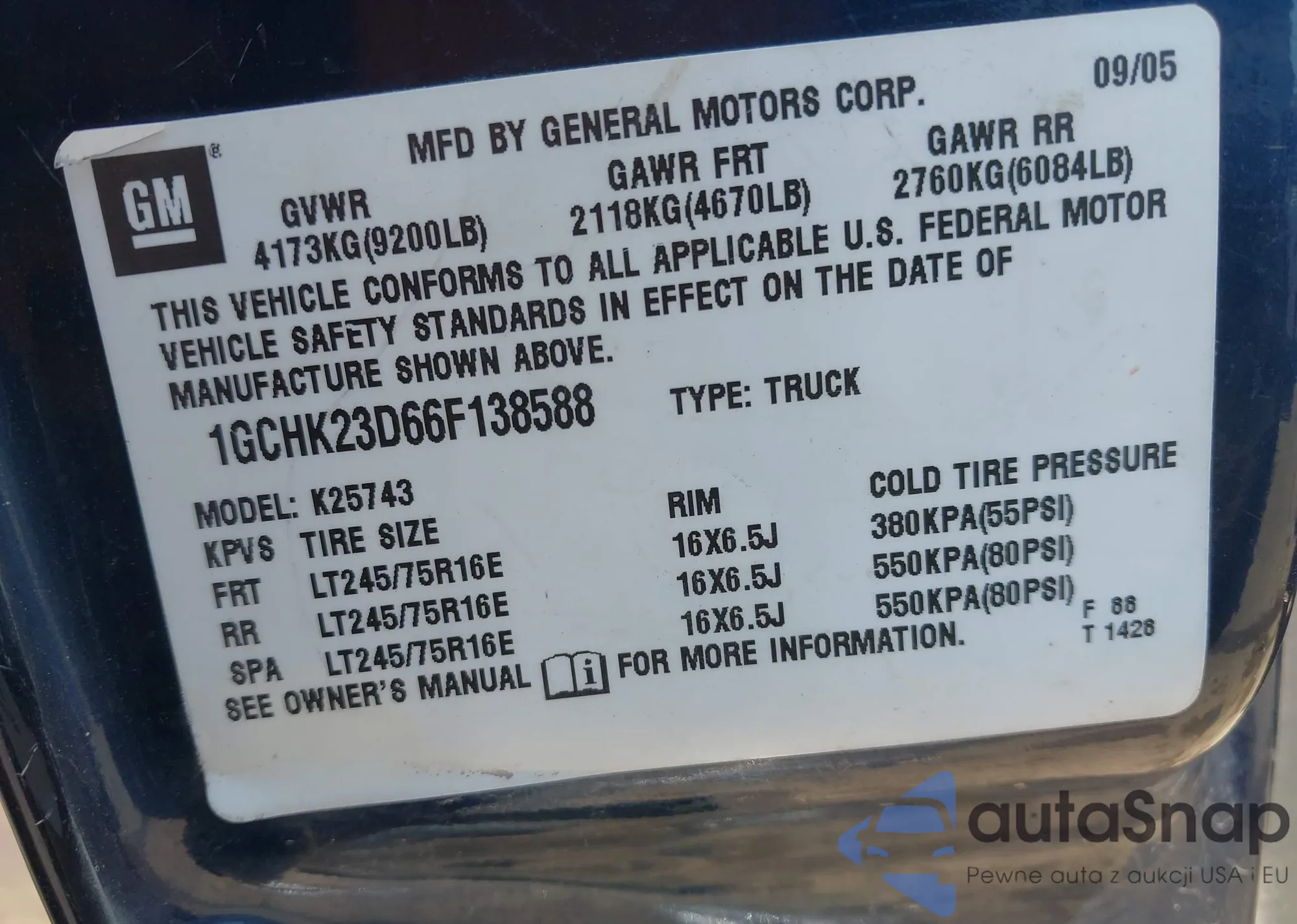 LOT: 42906729 VIN: 1GCHK23D66F138588
