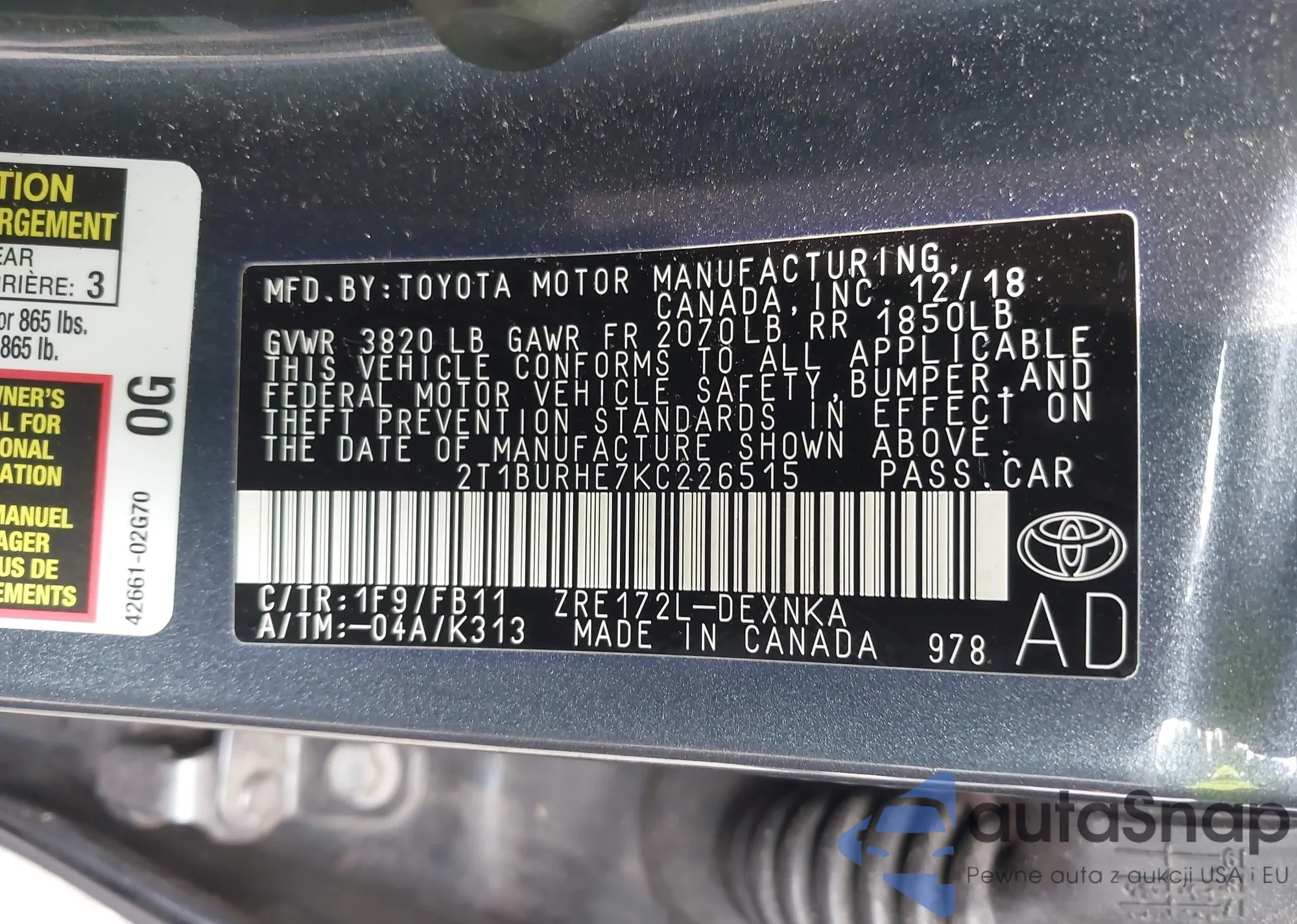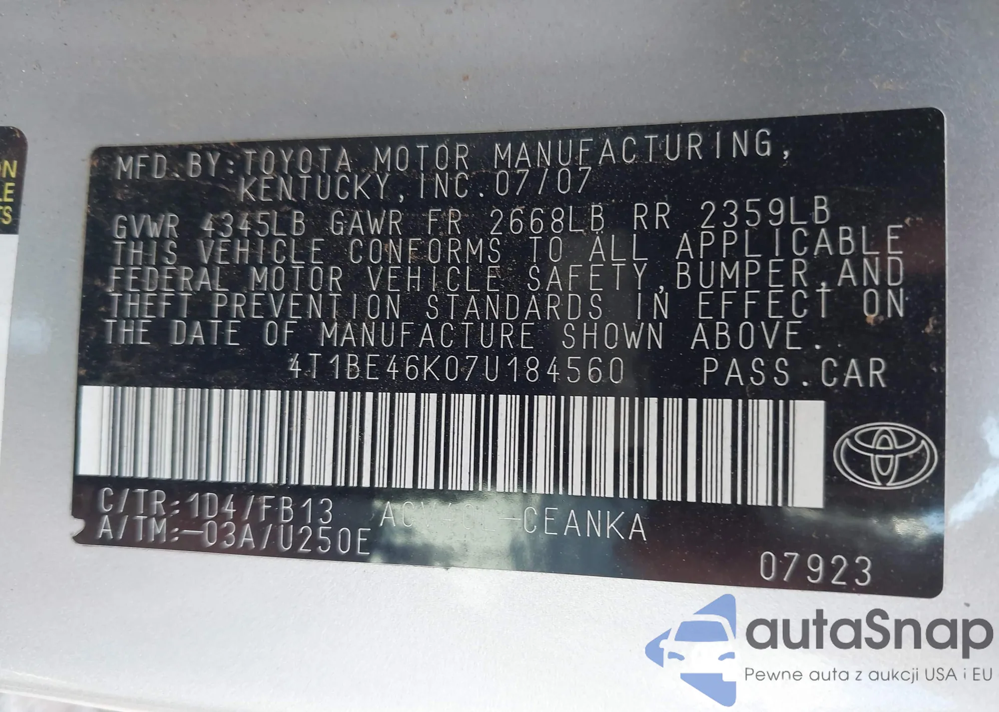 LOT: 42911878 VIN: 4T1BE46K07U184560