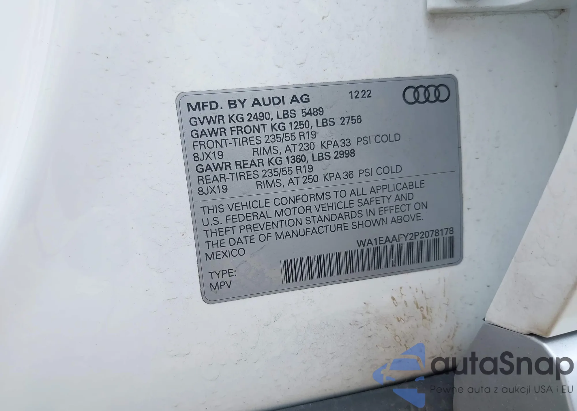 LOT: 42728023 VIN: WA1EAAFY2P2078178
