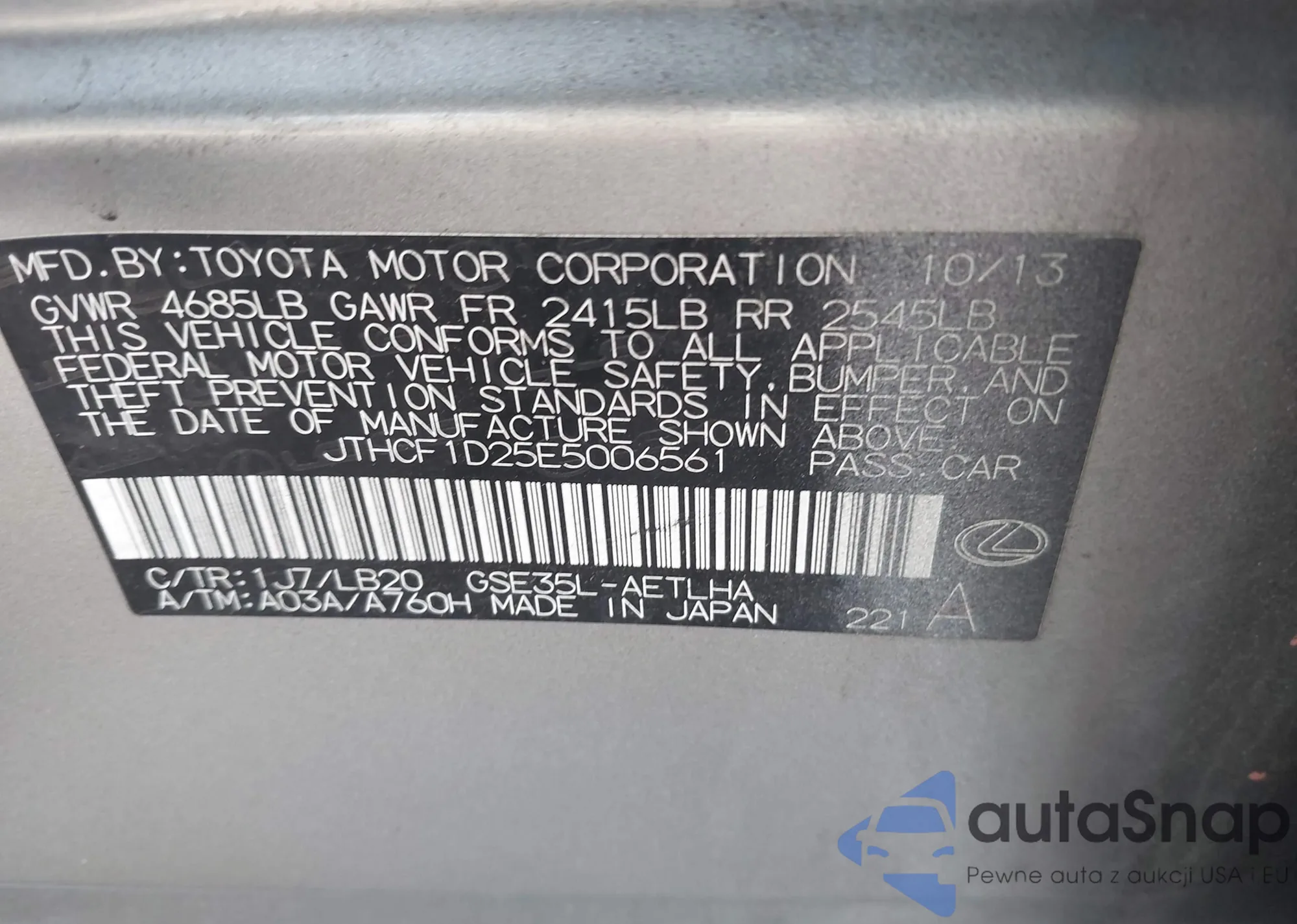 LOT: 42872468 VIN: JTHCF1D25E5006561