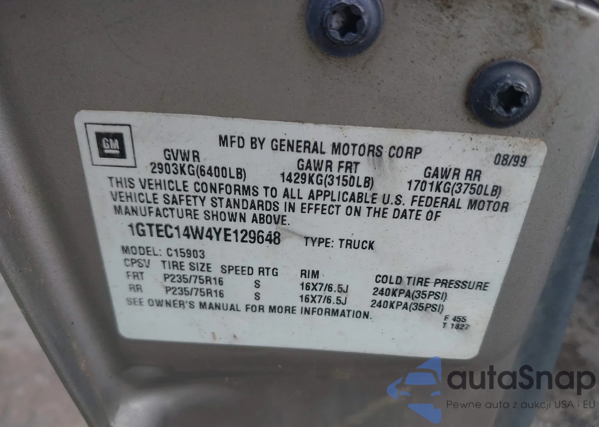 LOT: 42707518 VIN: 1GTEC14W4YE129648