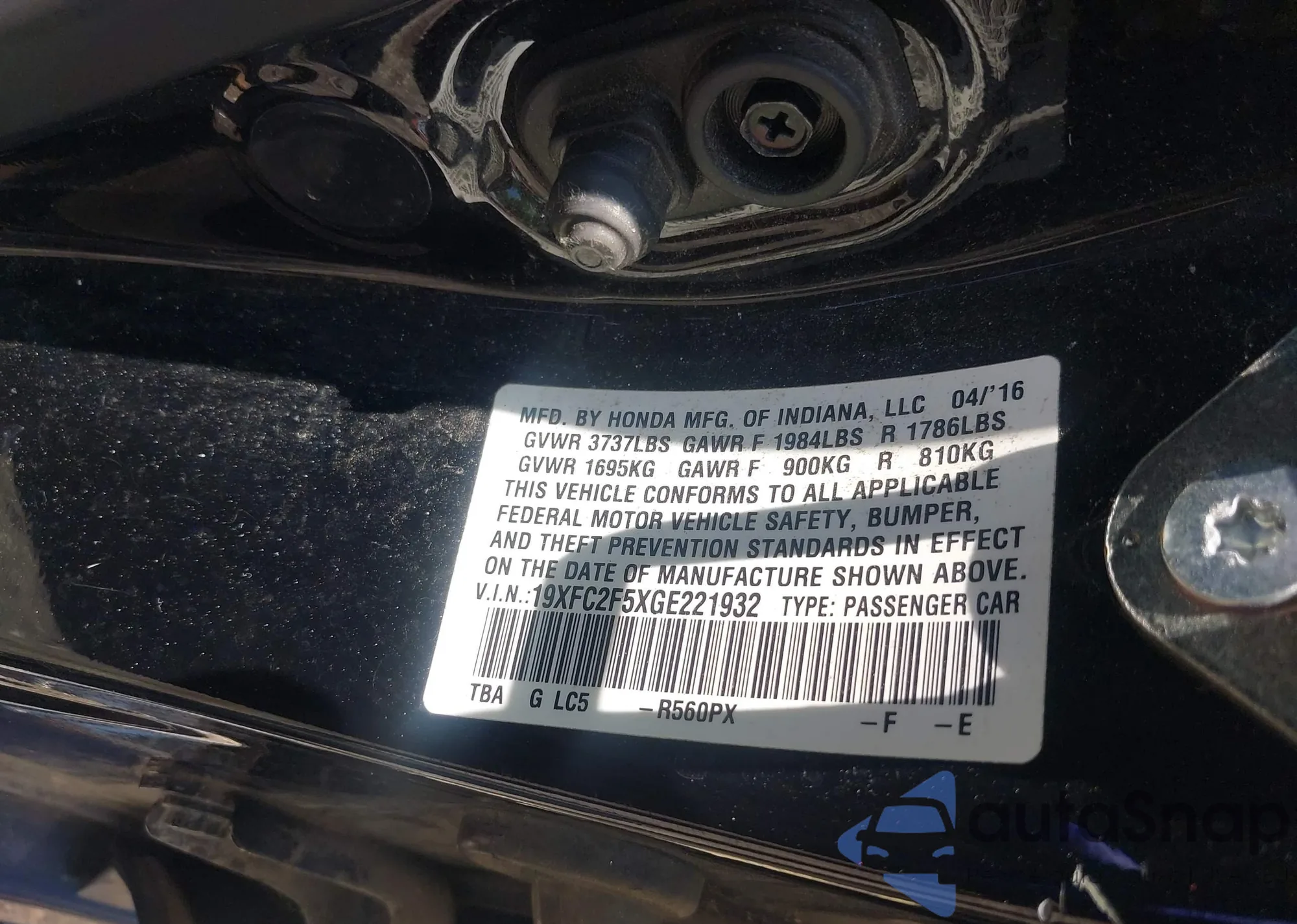 LOT: 42563773 VIN: 19XFC2F5XGE221932