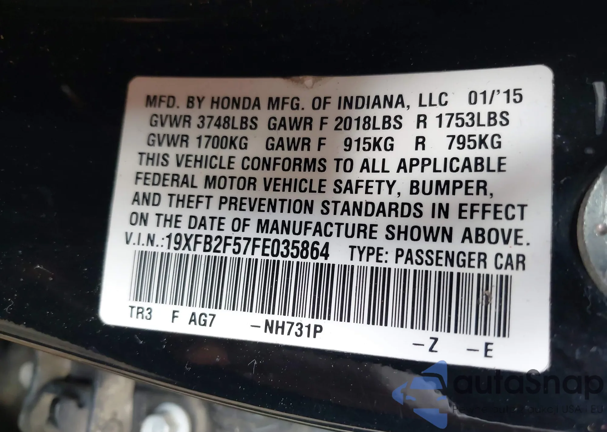 LOT: 42744978 VIN: 19XFB2F57FE035864
