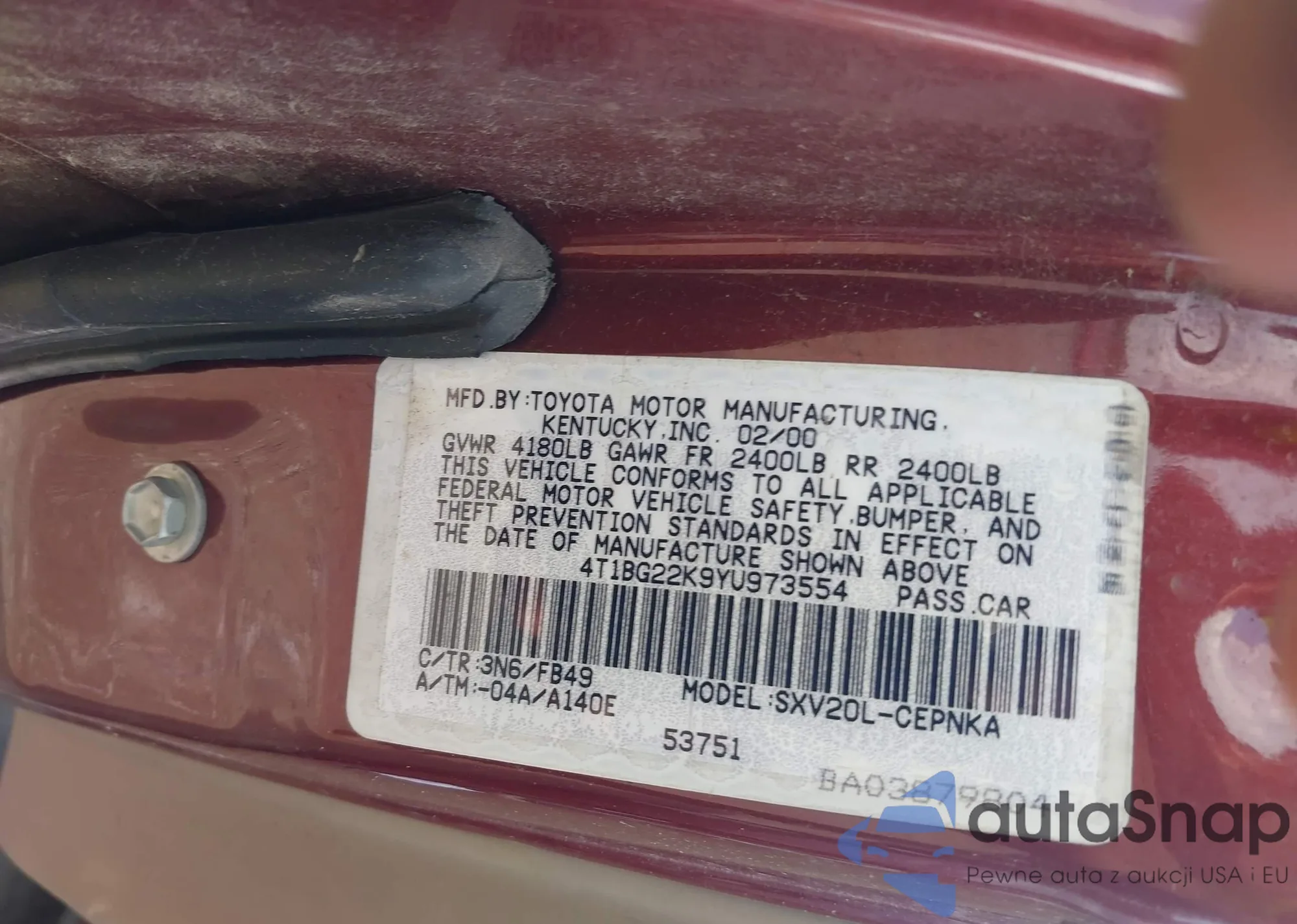 LOT: 42879284 VIN: 4T1BG22K9YU973554