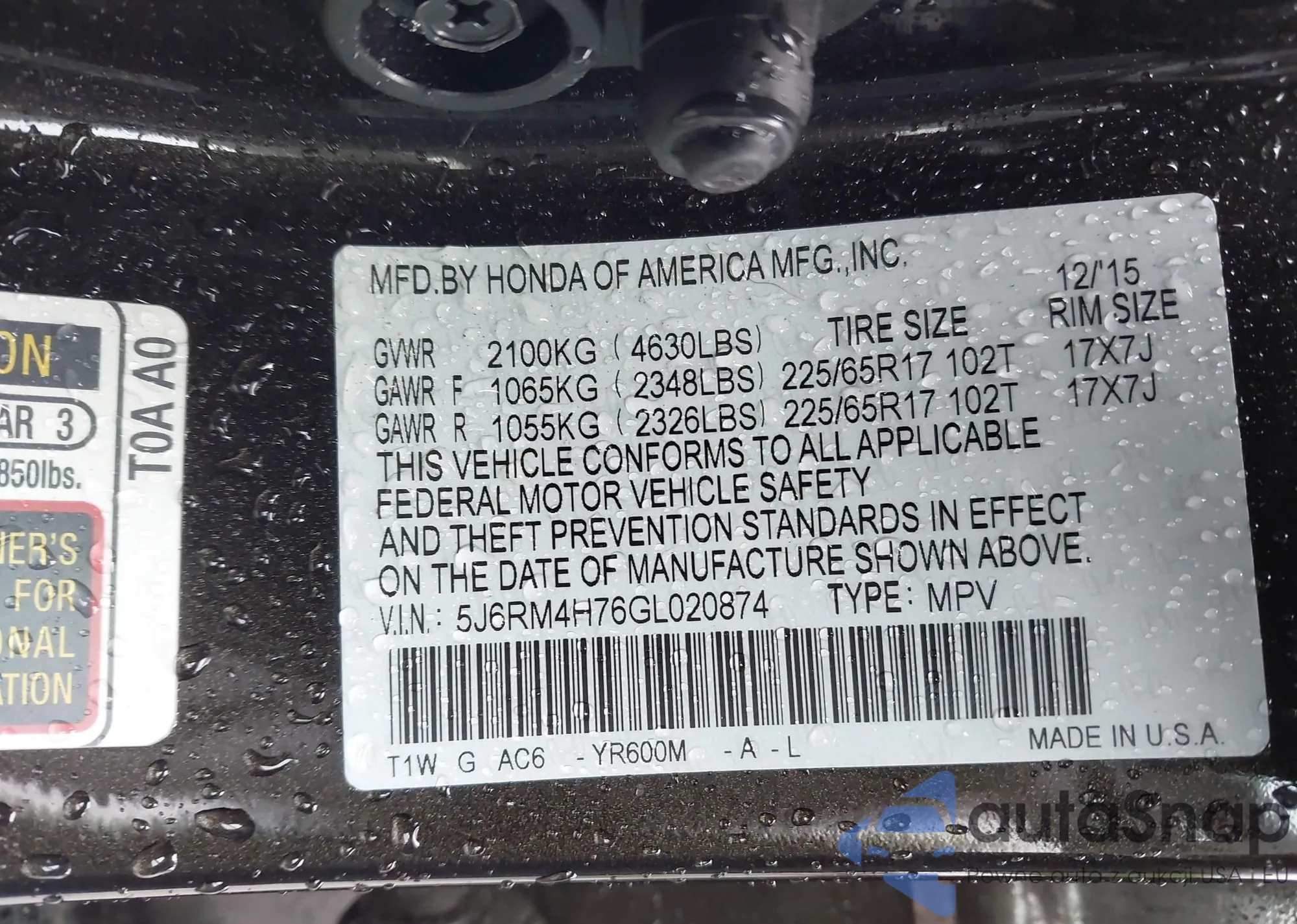 • VIN 5J6RM4H76GL020874