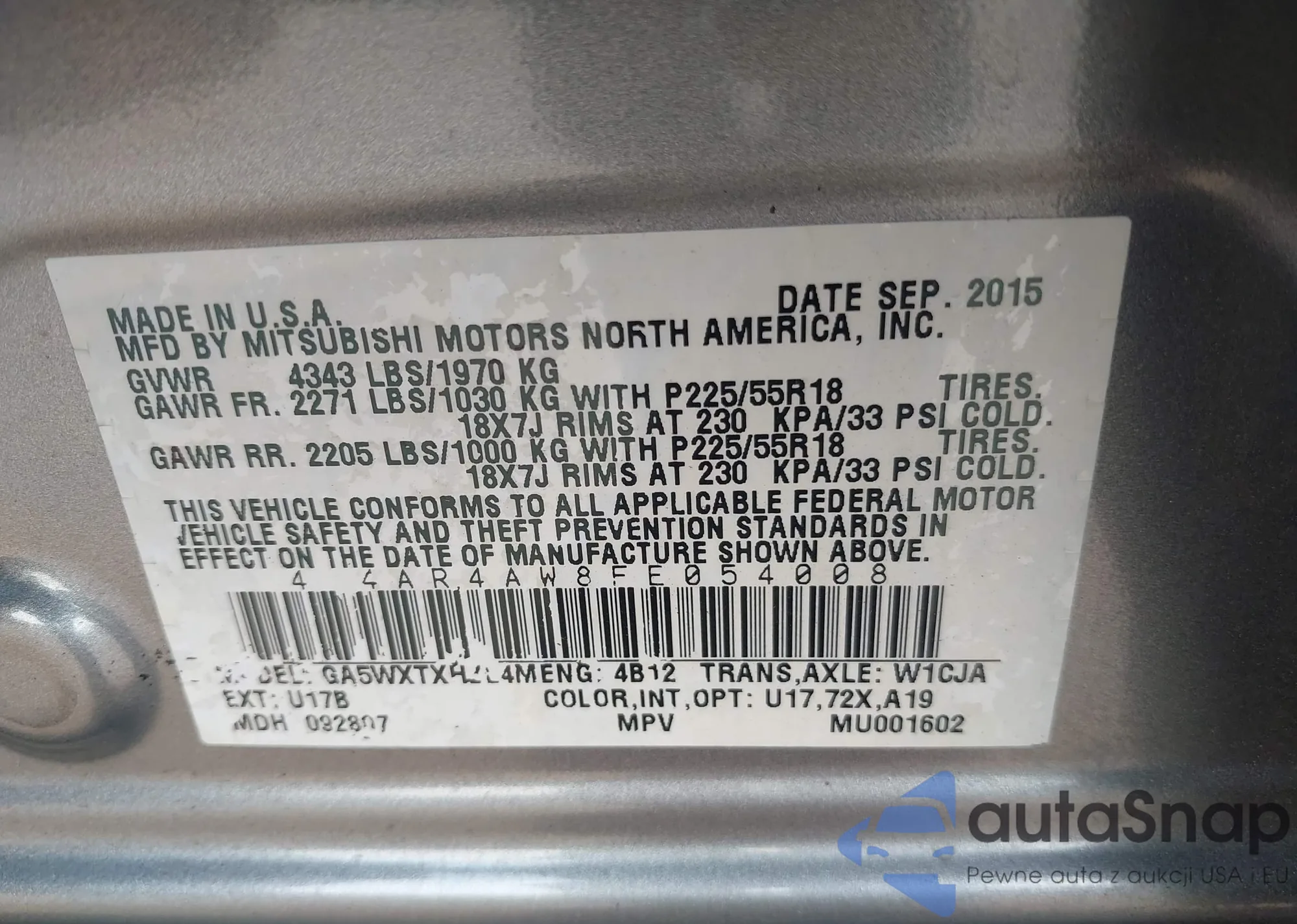 LOT: 42920474 VIN: 4A4AR4AW8FE054008