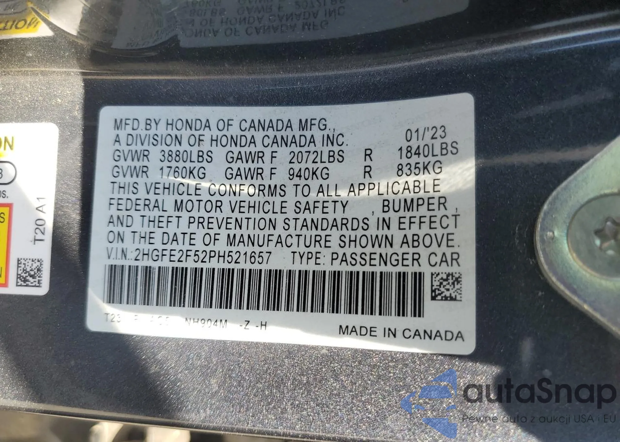 LOT: 63880625 VIN: 2HGFE2F52PH521657