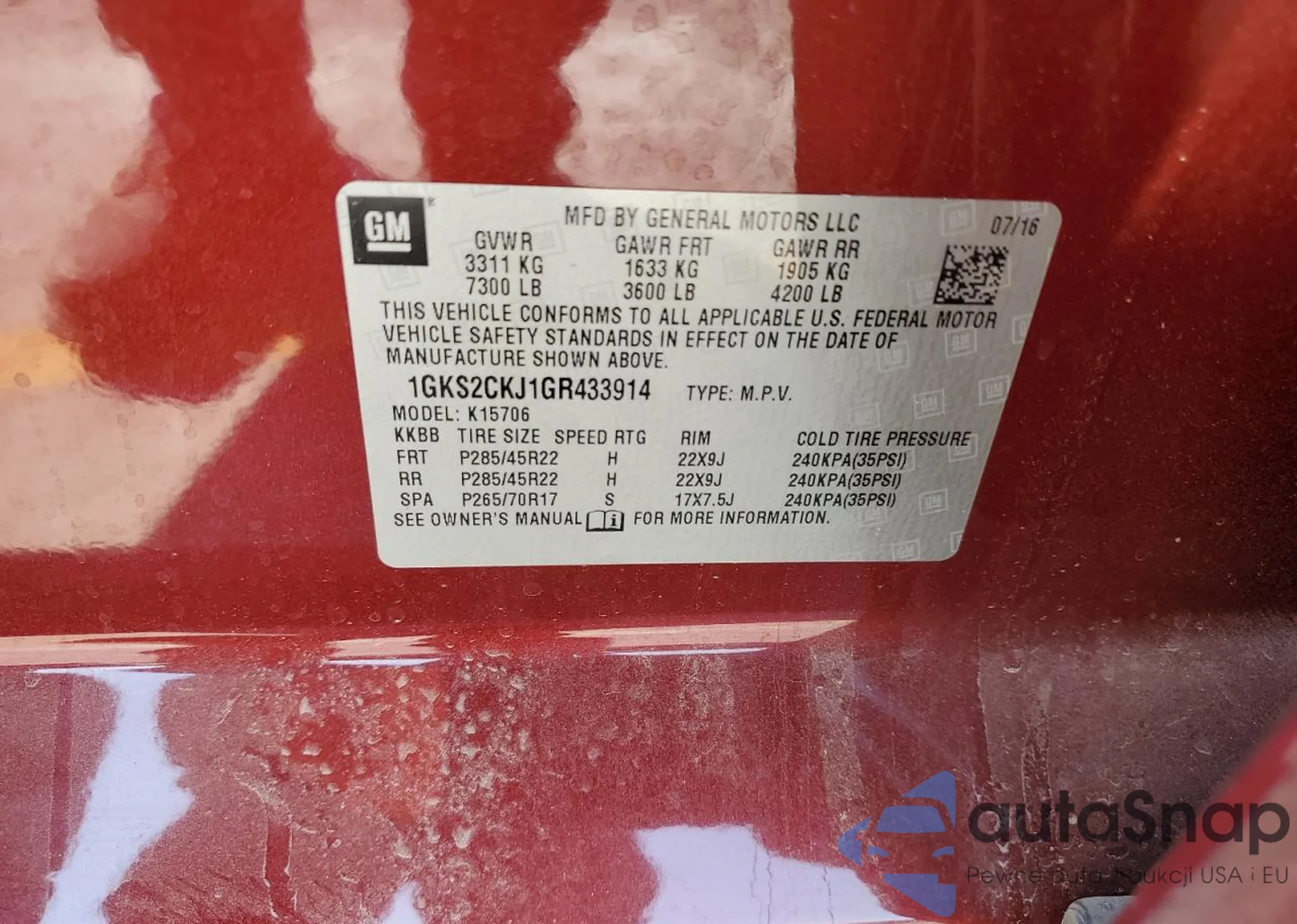LOT: 65275935 VIN: 1GKS2CKJ1GR433914