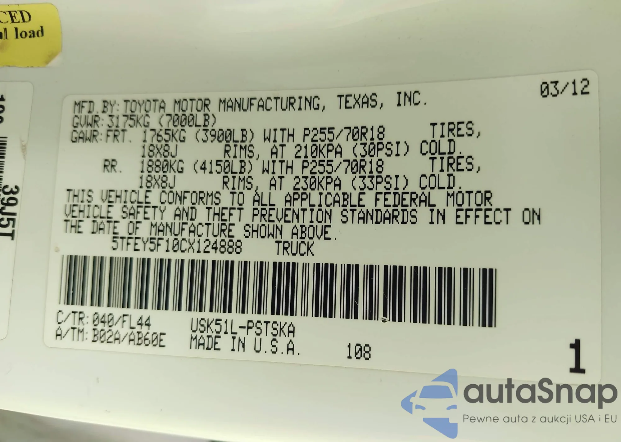 LOT: 42586561 VIN: 5TFEY5F10CX124888