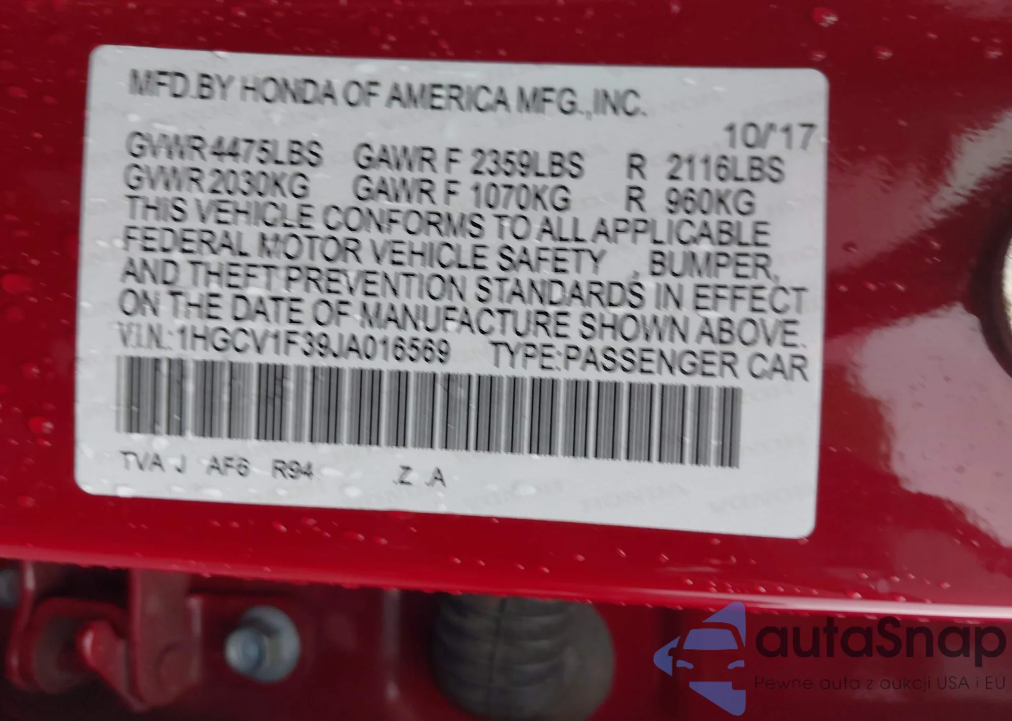 LOT: 42371186 VIN: 1HGCV1F39JA016569