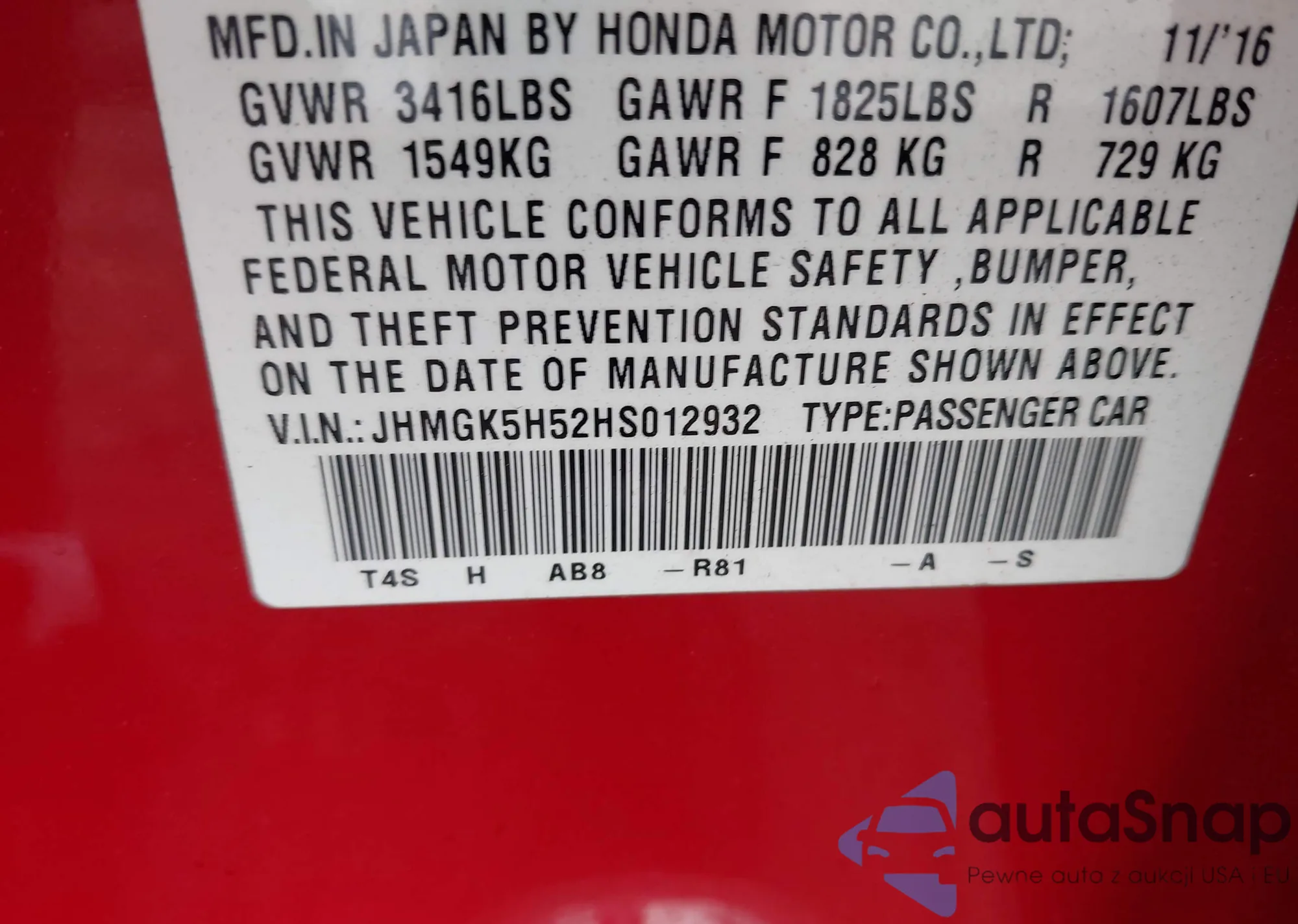 LOT: 42714566 VIN: JHMGK5H52HS012932