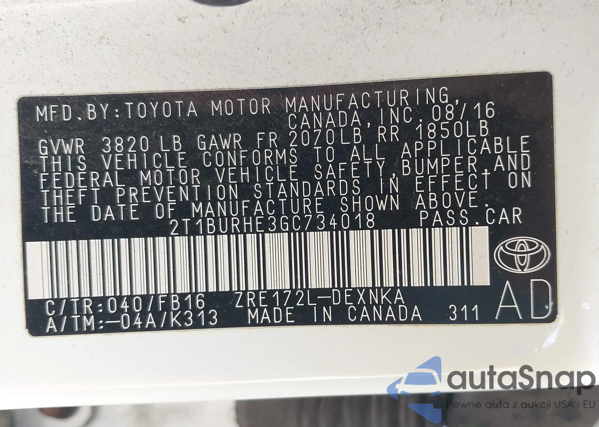 • VIN 2T1BURHE3GC734018