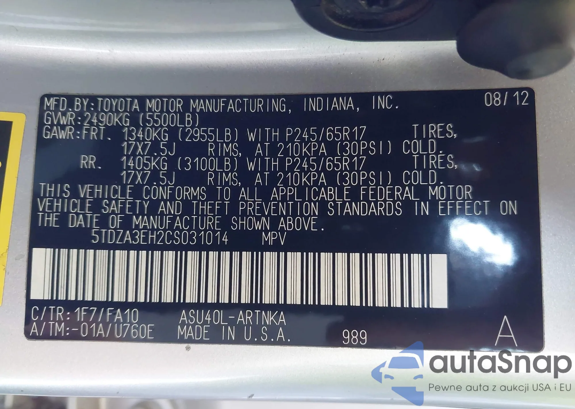 • VIN 5TDZA3EH2CS031014