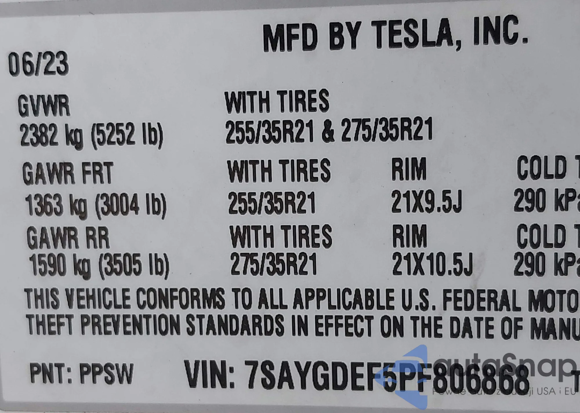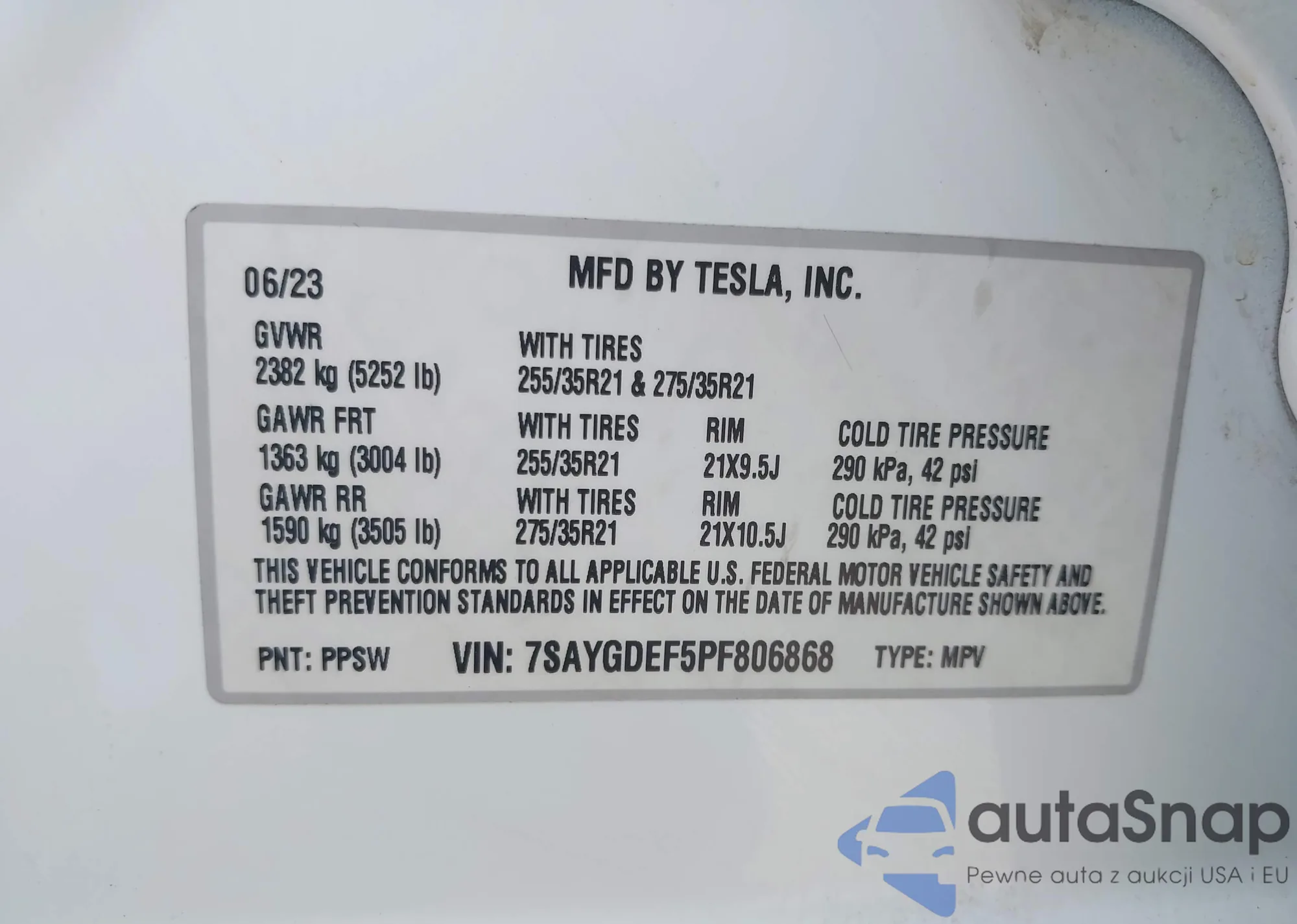 • VIN 7SAYGDEF5PF806868