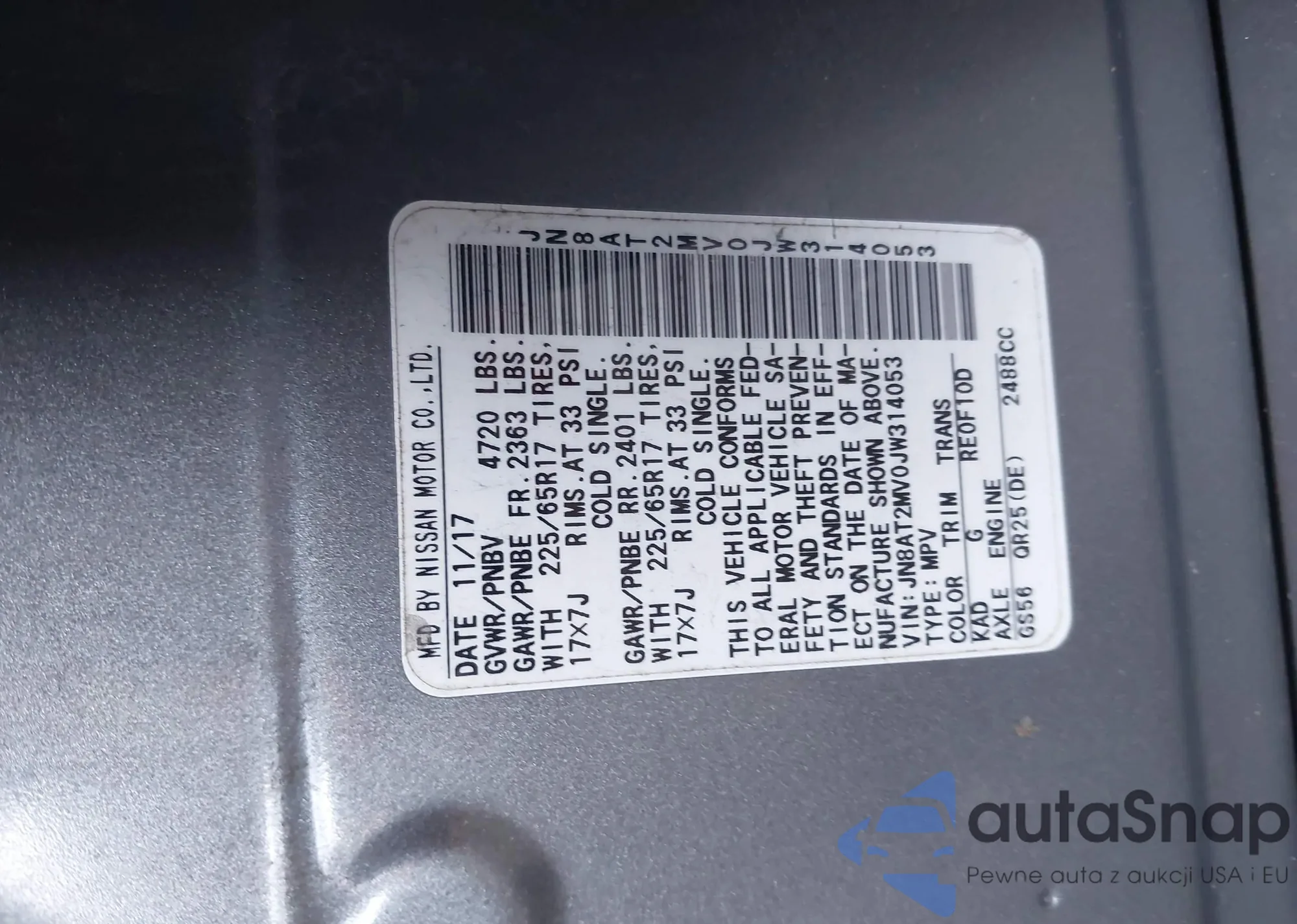 LOT: 42779814 VIN: JN8AT2MV0JW314053