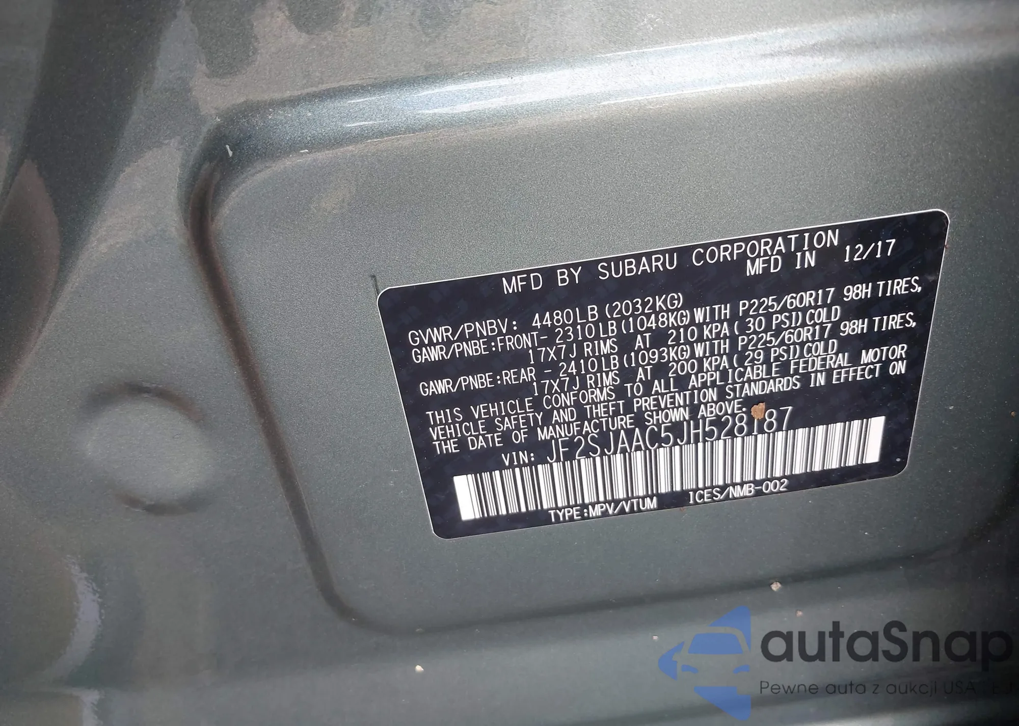 LOT: 42791304 VIN: JF2SJAAC5JH528187