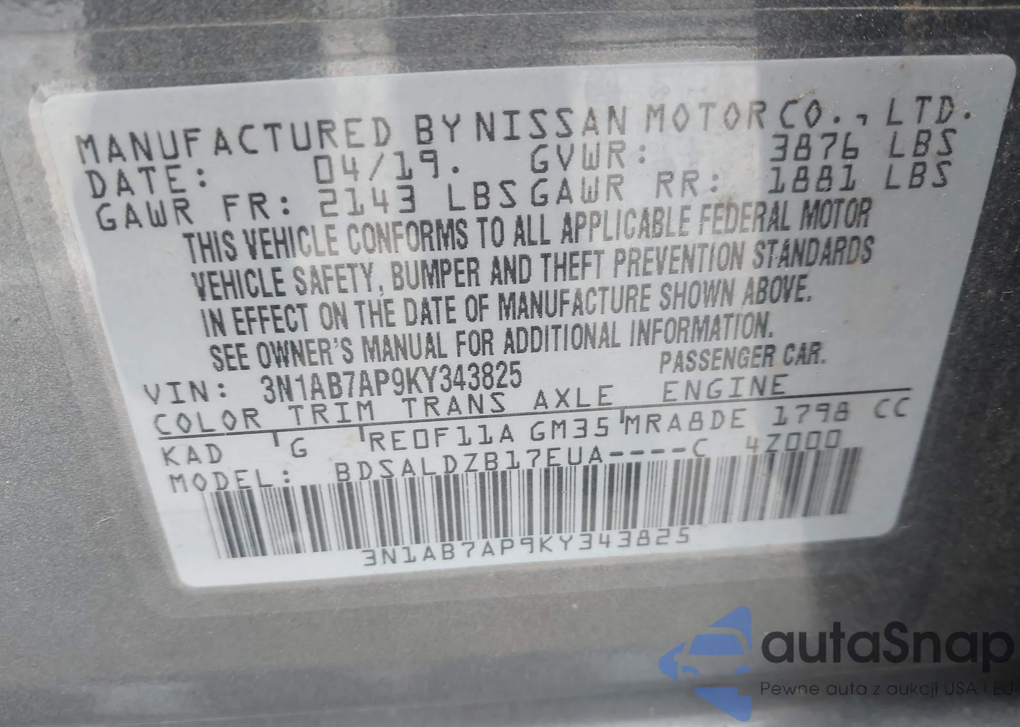 LOT: 42767805 VIN: 3N1AB7AP9KY343825