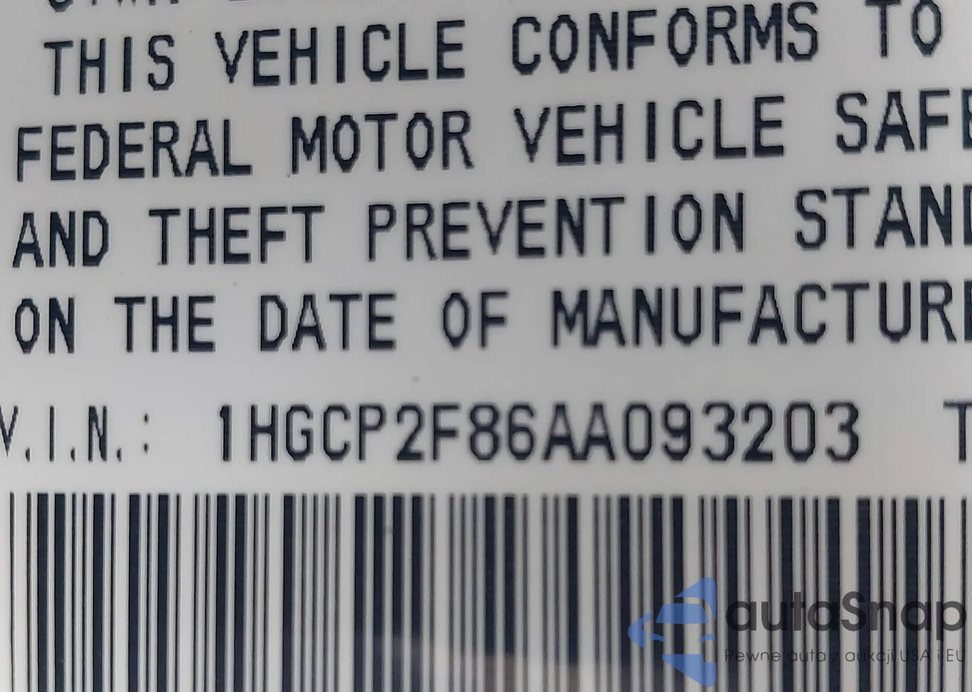 • VIN 1HGCP2F86AA093203