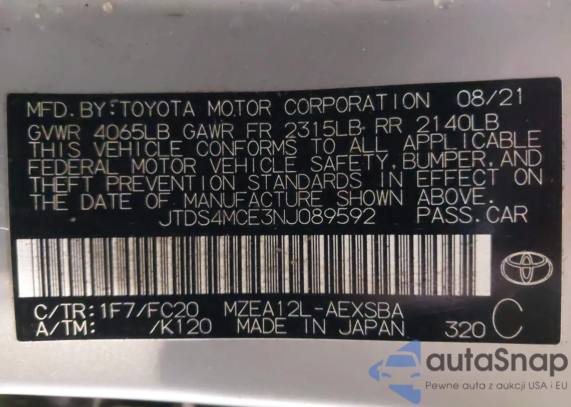 LOT: 42318746 VIN: JTDS4MCE3NJ089592
