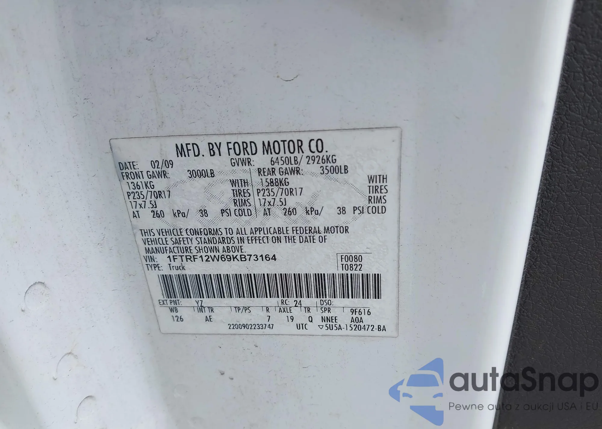 LOT: 42931465 VIN: 1FTRF12W69KB73164