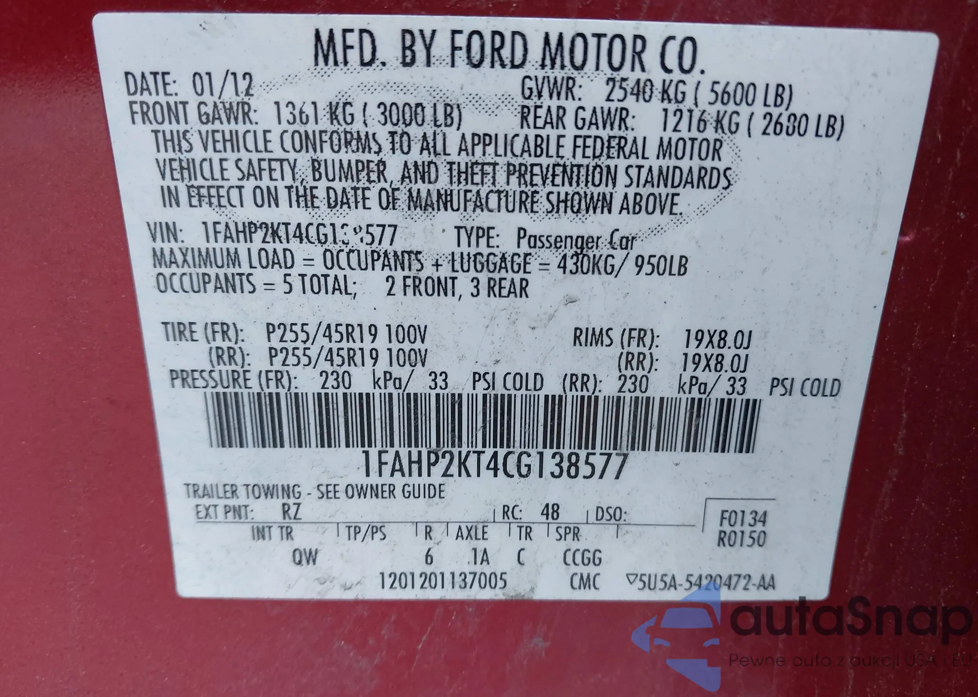 • VIN 1FAHP2KT4CG138577