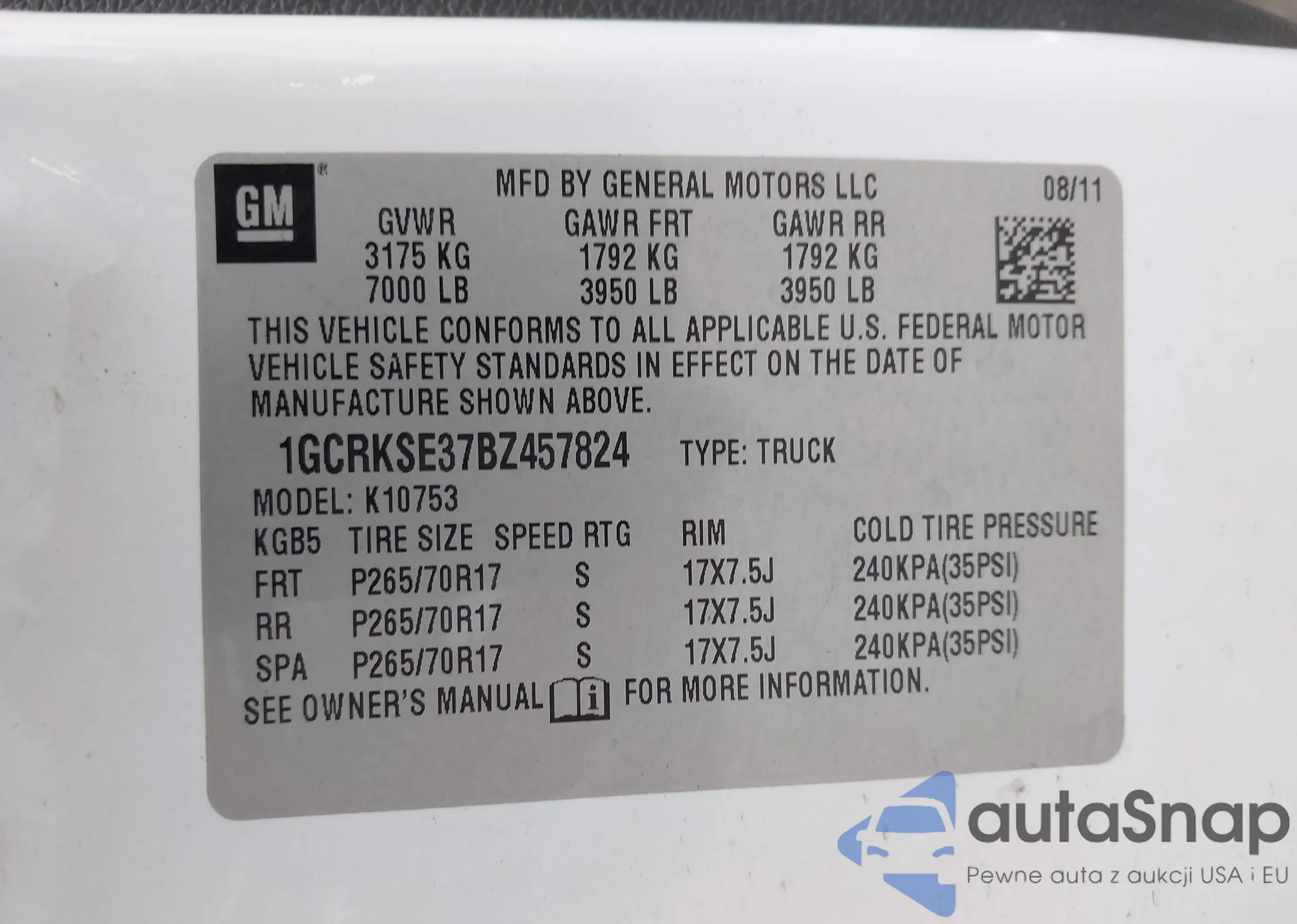 • VIN 1GCNKSE07BZ178555