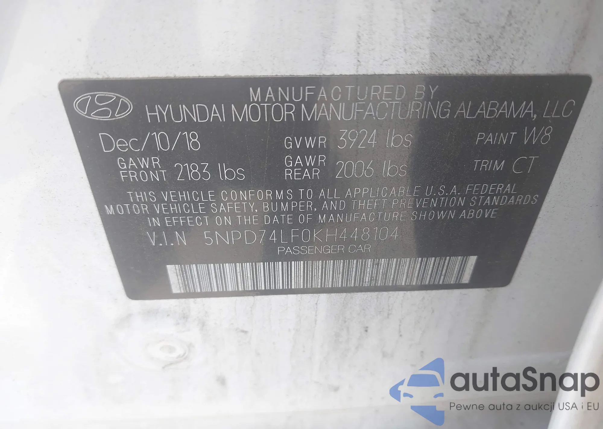 LOT: 42723779 VIN: 5NPD74LF0KH448104