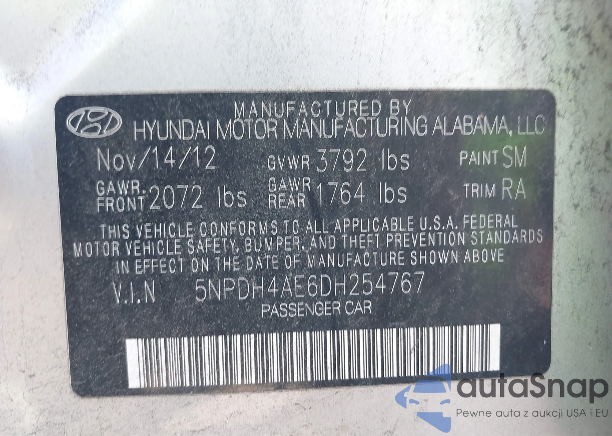 LOT: 42816532 VIN: 5NPDH4AE6DH254767