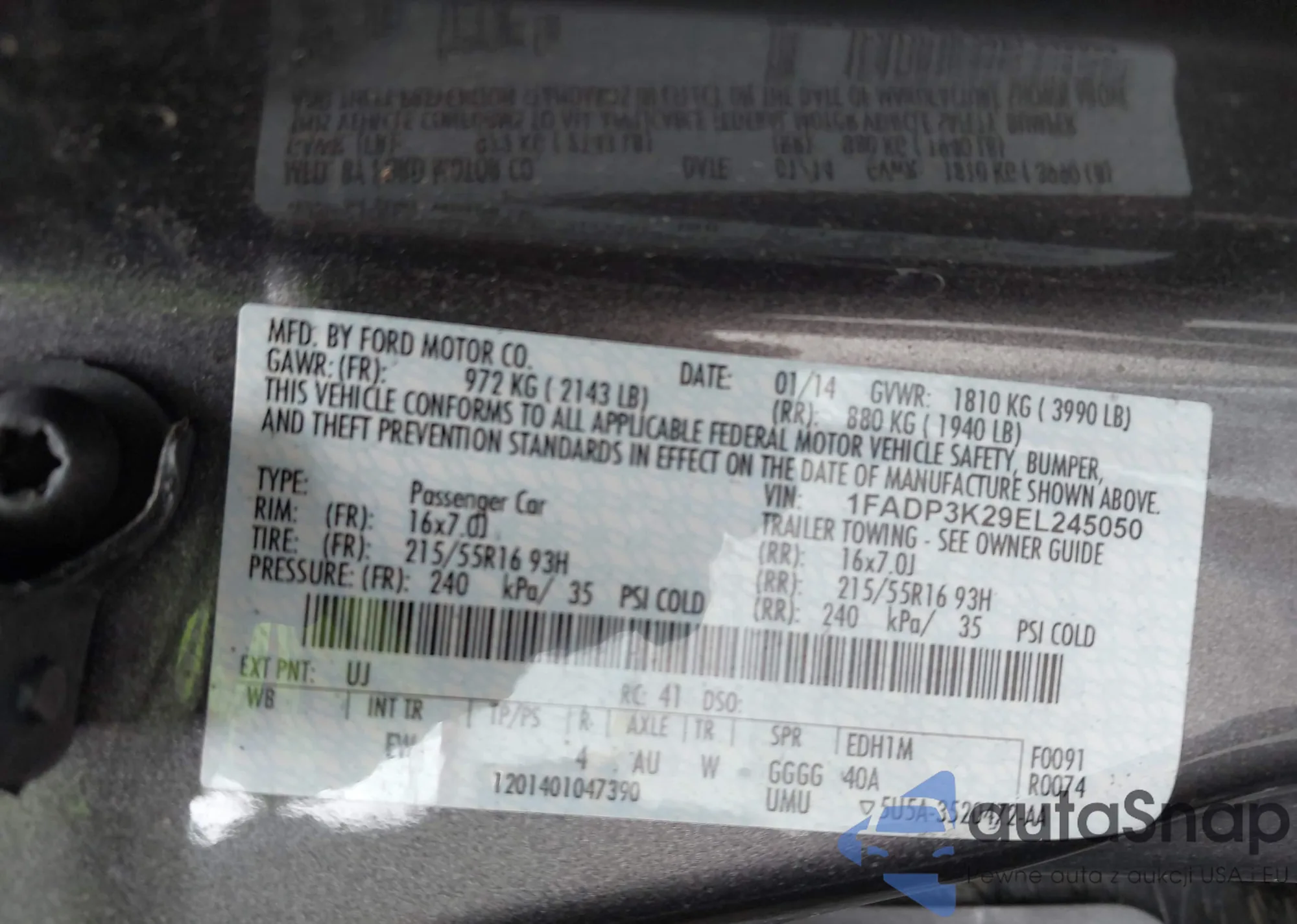 LOT: 42780172 VIN: 1FADP3K29EL245050