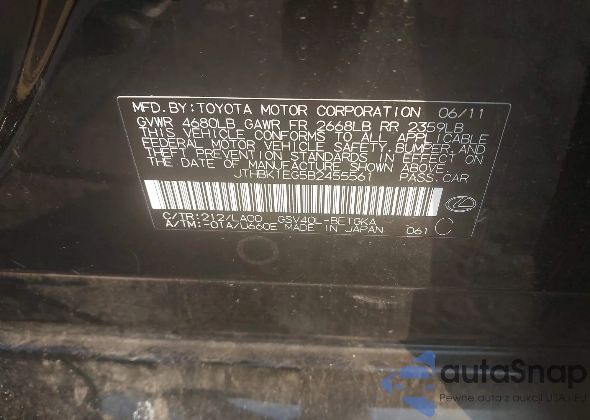 LOT: 42796471 VIN: JTHBK1EG5B2455561