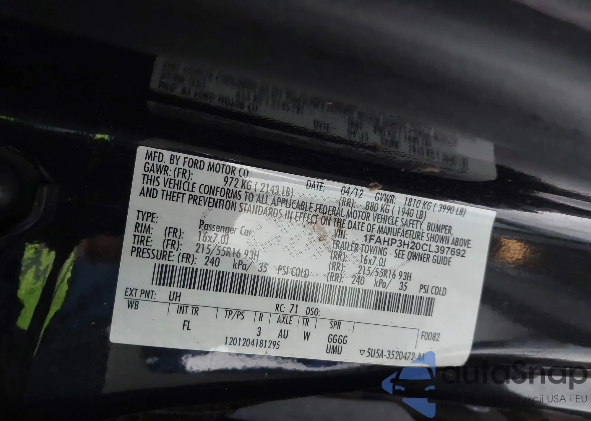 LOT: 42800101 VIN: 1FAHP3H20CL397692