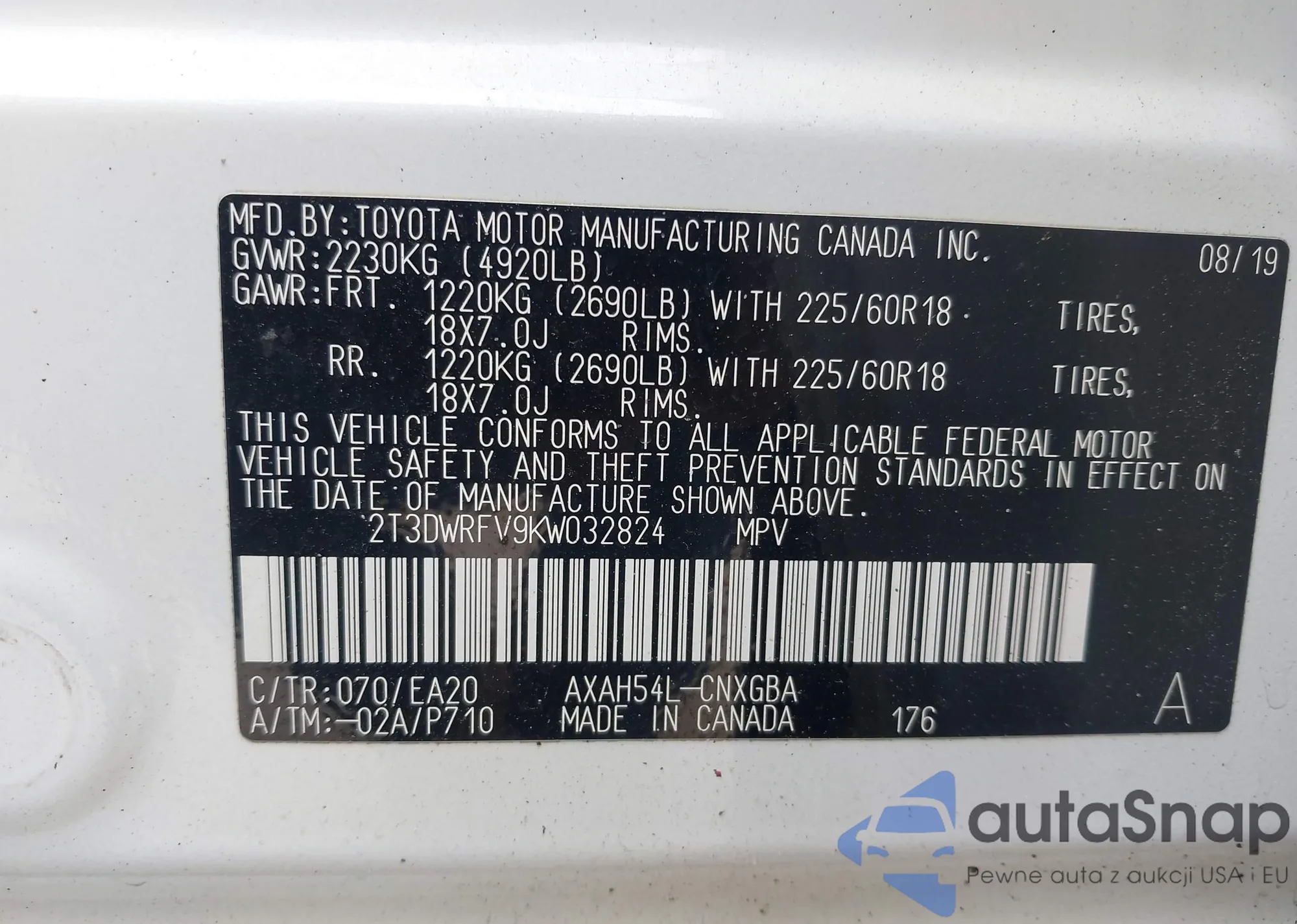 LOT: 42476319 VIN: 2T3DWRFV9KW032824